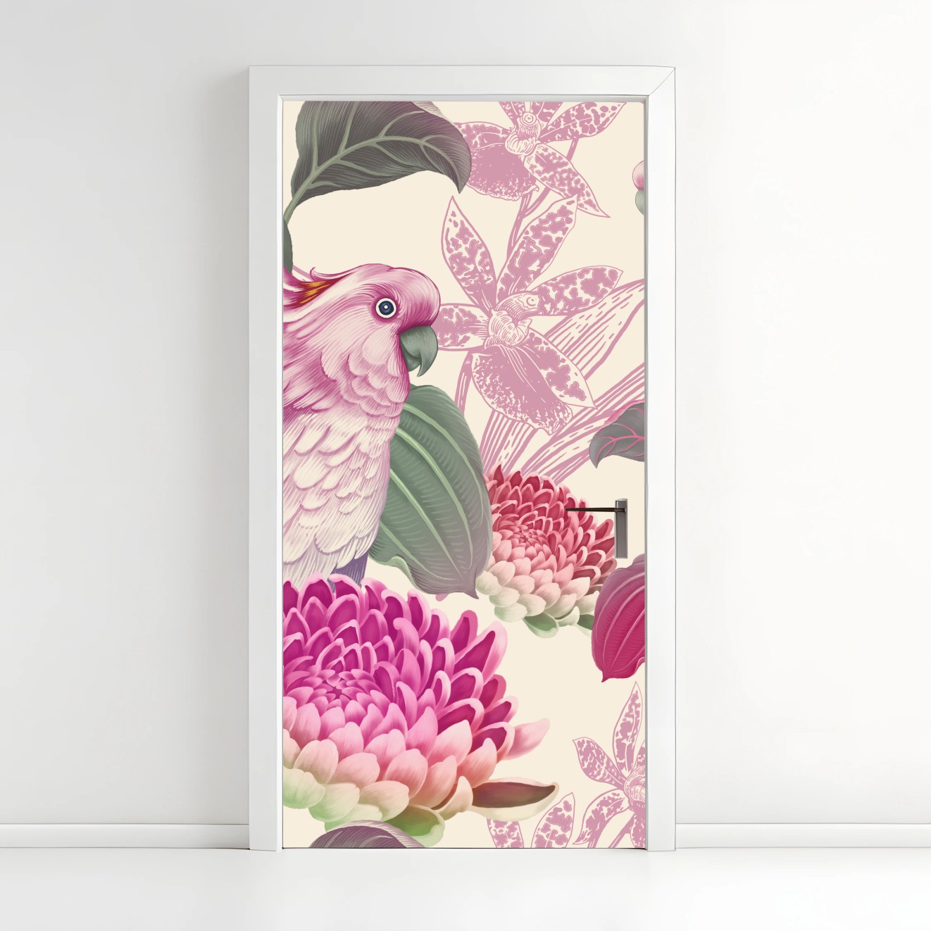 Adesivo per porta Cacatua rosa su motivo botanico elegante