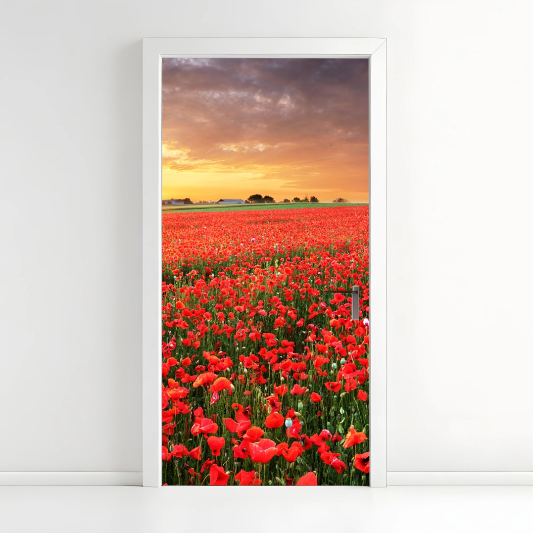 Adesivo per porta Tramonto sul campo di papaveri