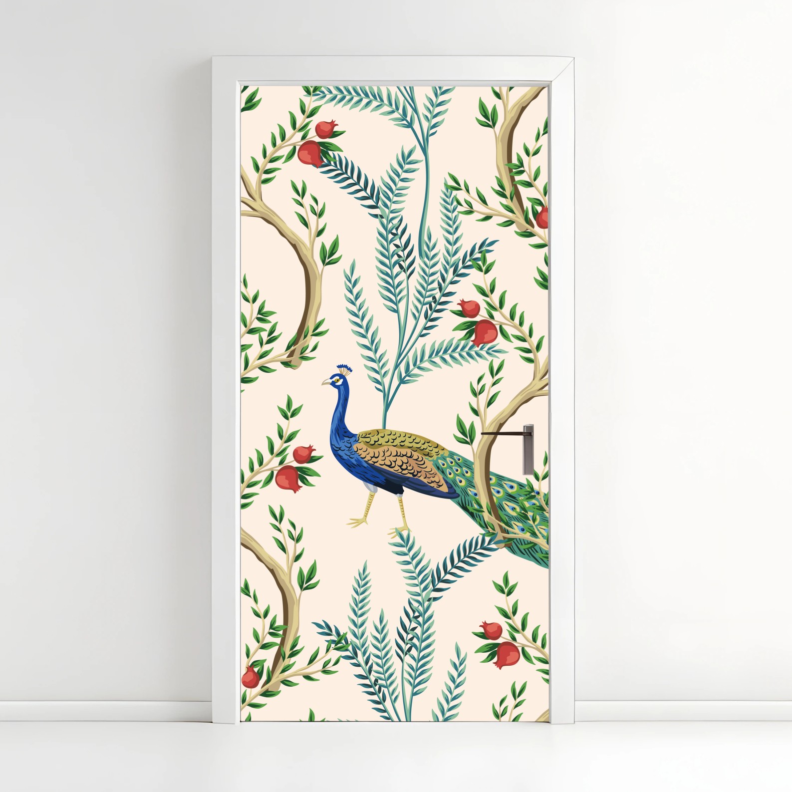 Adesivo per porta Pavone e melograni su motivo botanico elegante