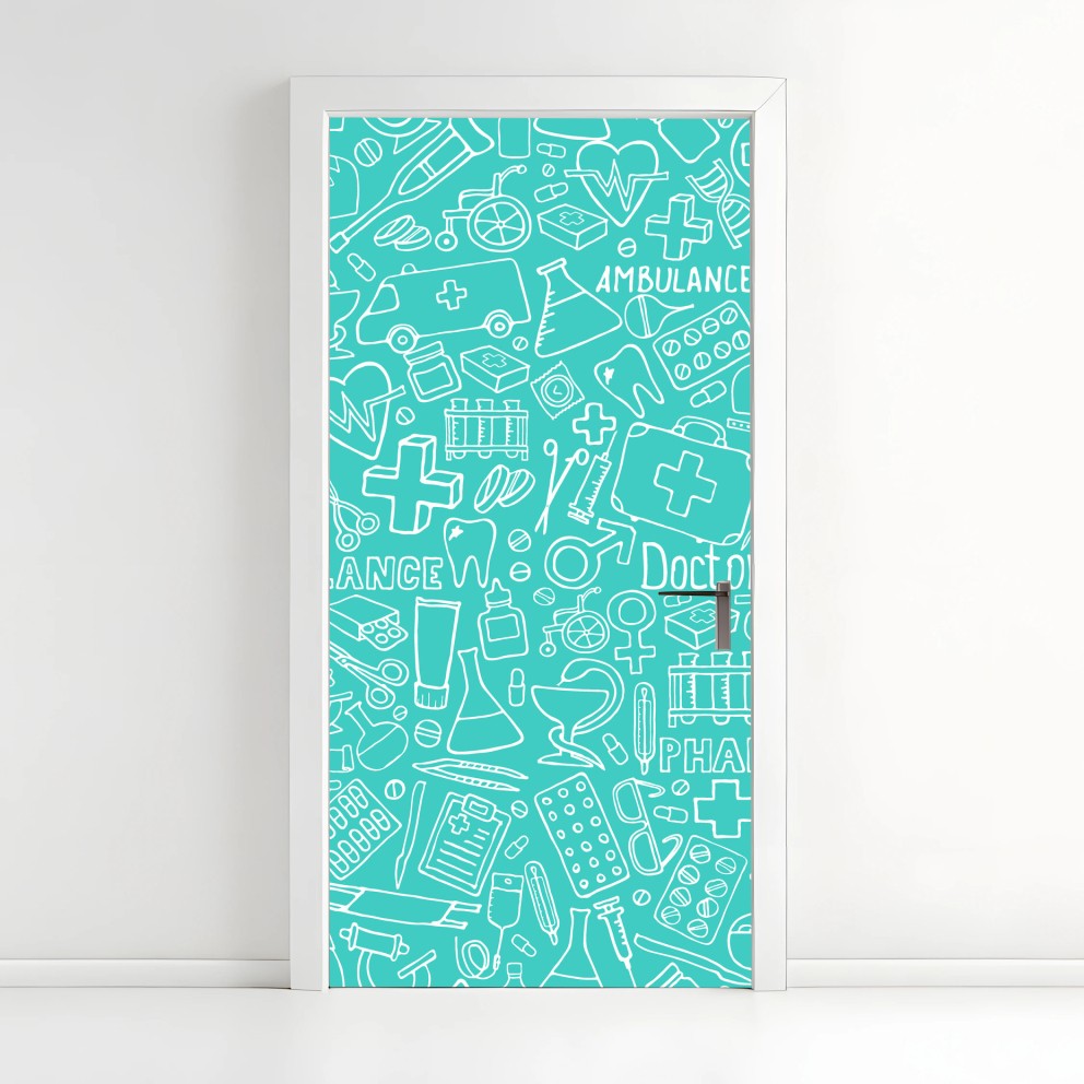 Adesivo per porta Pattern sanitario turchese con icone mediche