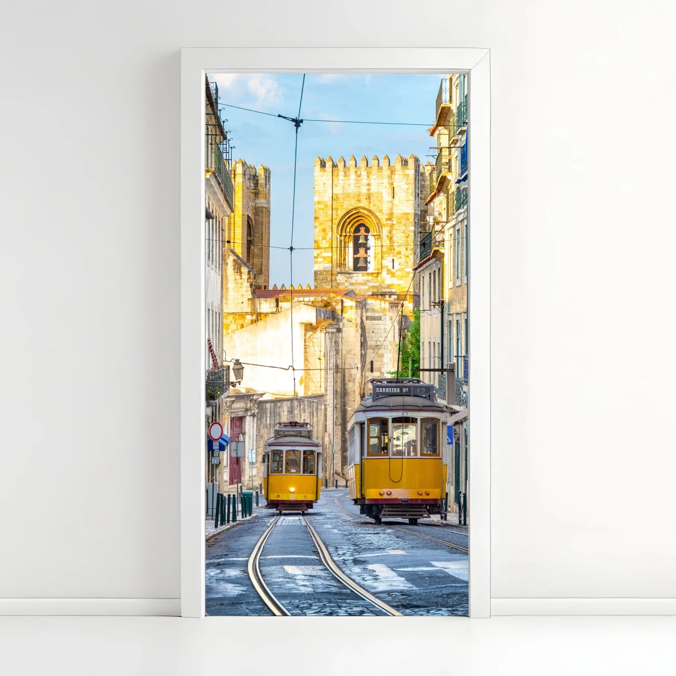 Adesivo per porta Tram gialli di Lisbona, scorcio urbano