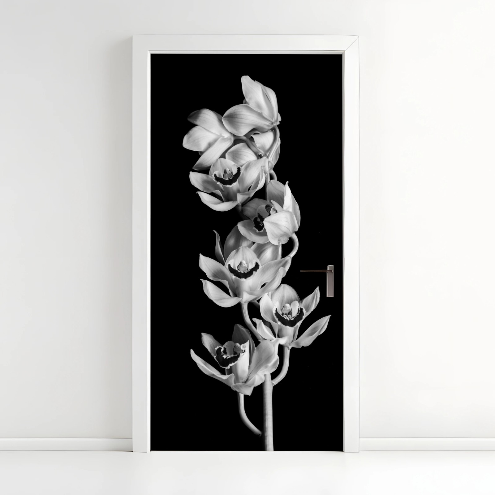 Adesivo per porta Eleganza di orchidee in bianco e nero