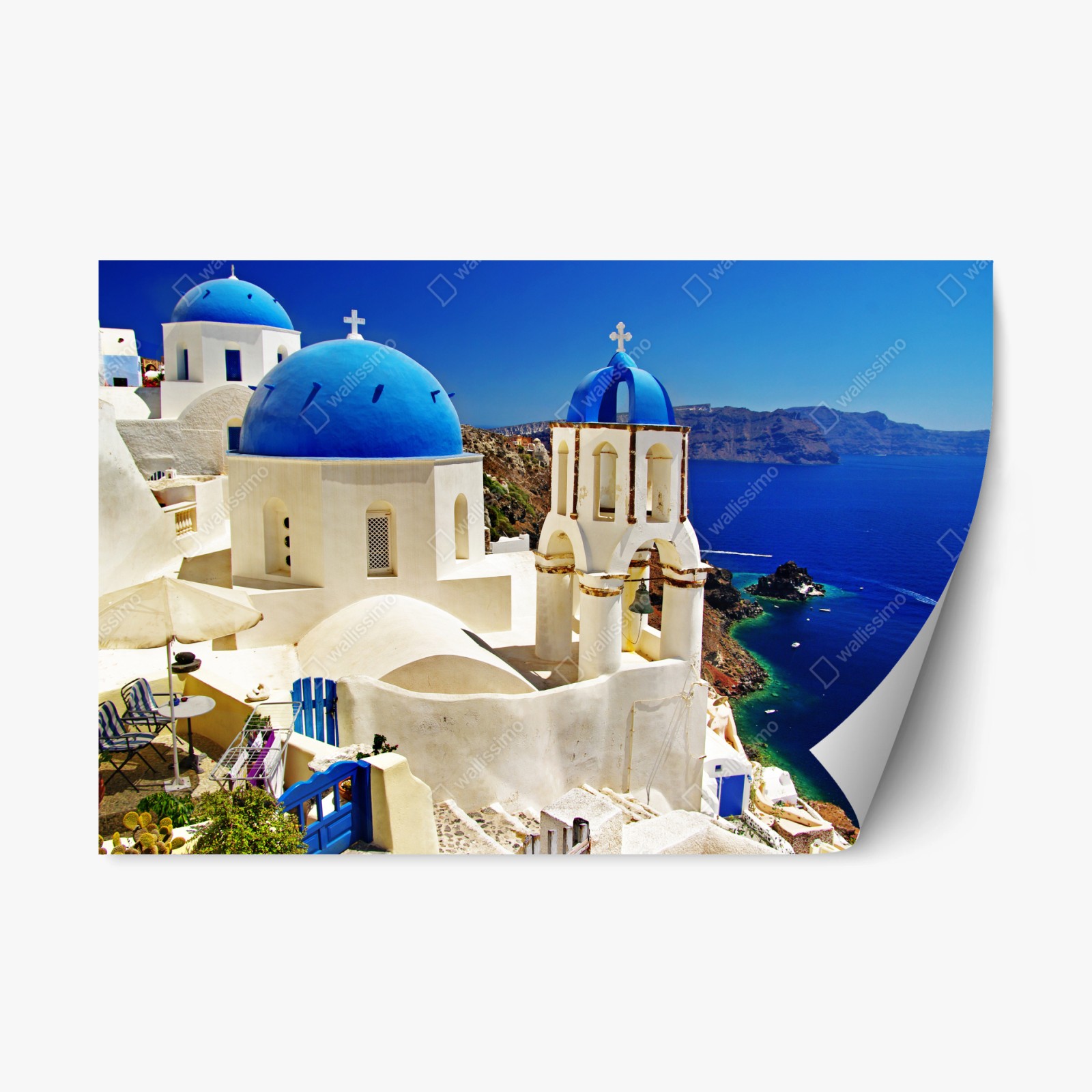 Adesivo riposizionabile Cupole blu di Santorini sul mare