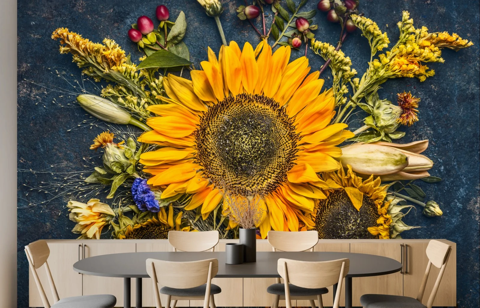 - fiori, girasoli, decorazione, bouquet, colori caldi, autunno, foglie, composizione floreale, rustico, natura morta
