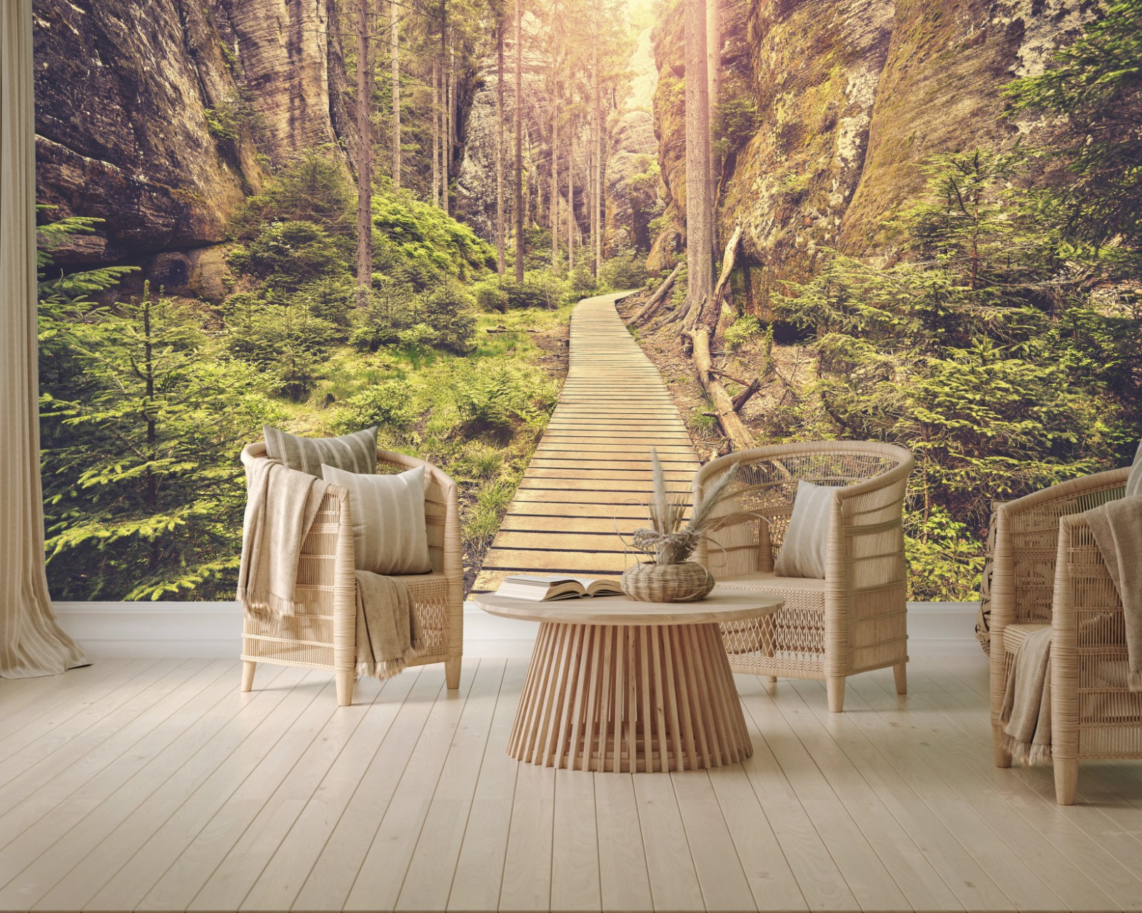 - foresta, paesaggio, sentiero, alberi, rocce, muschio, luce dorata, atmosfera vintage, passerella in legno, canyon roccioso