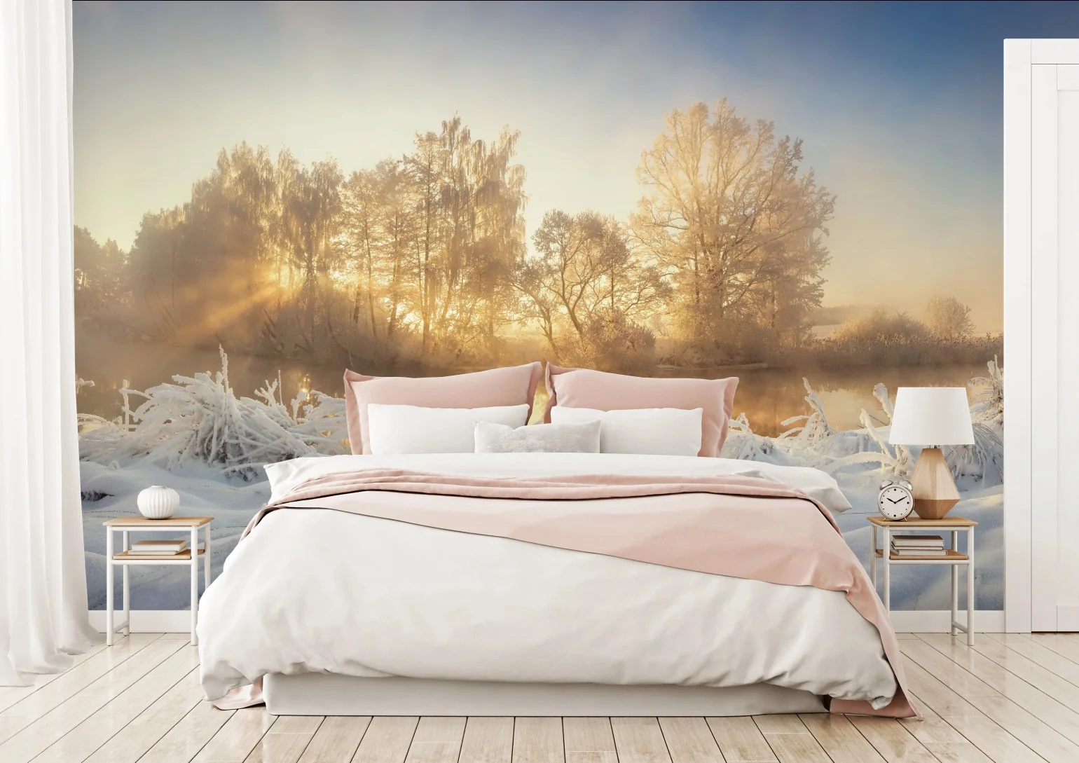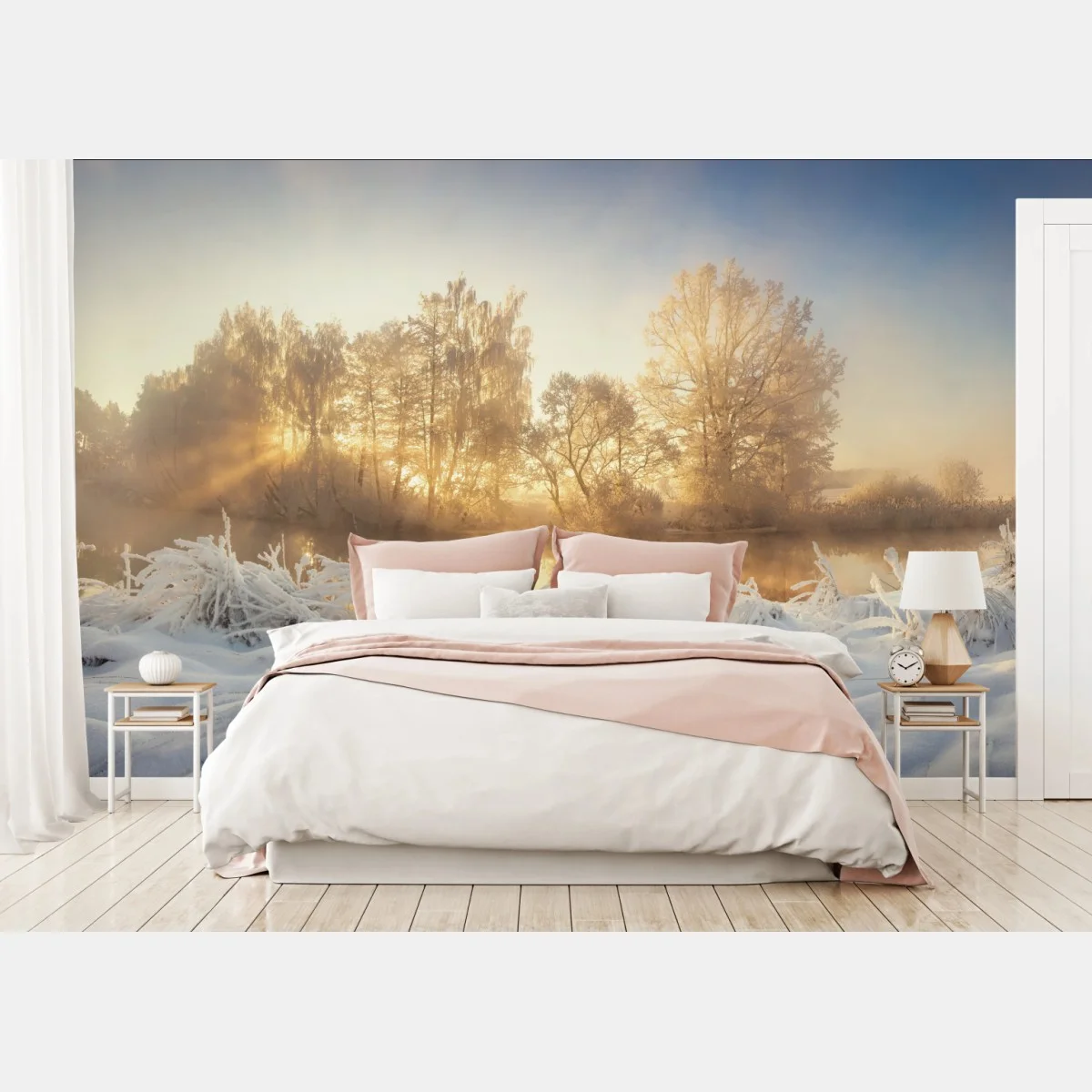 - alba, neve, inverno, paesaggio invernale, luce mattutina, brina, nebbia leggera, alberi ghiacciati, riflesso sull'acqua, atmosfera suggestiva