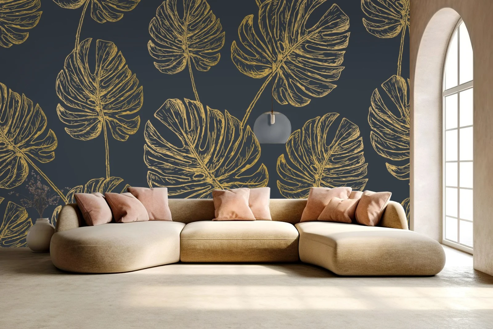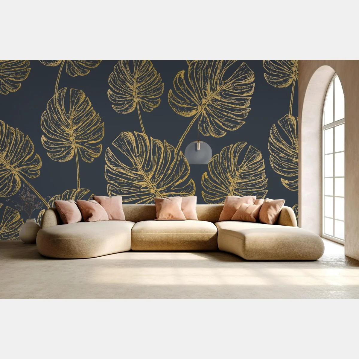Carta da parati Fogliame di monstera dorata su sfondo antracite