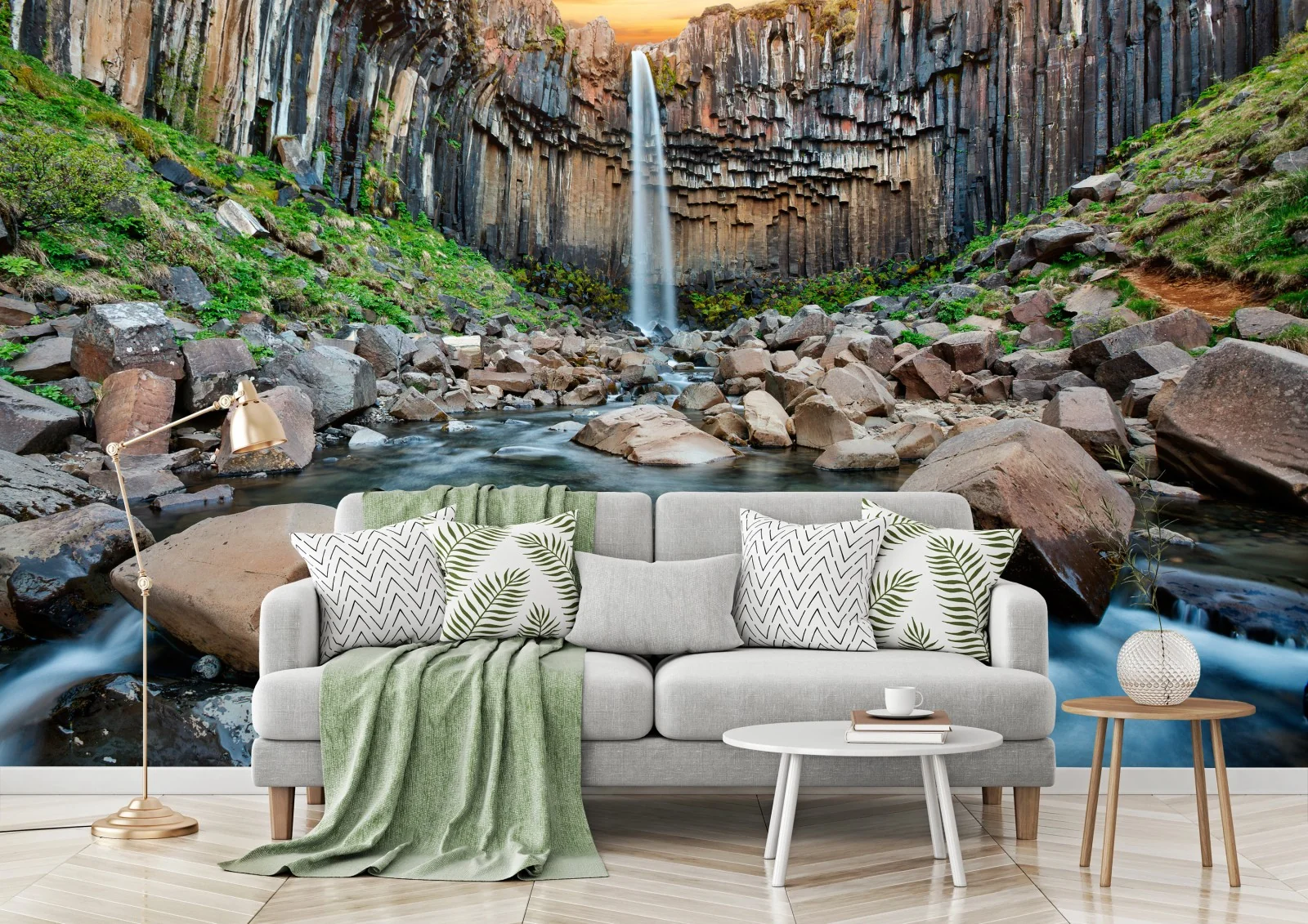 Carta da parati Cascata tra colonne di basalto al tramonto