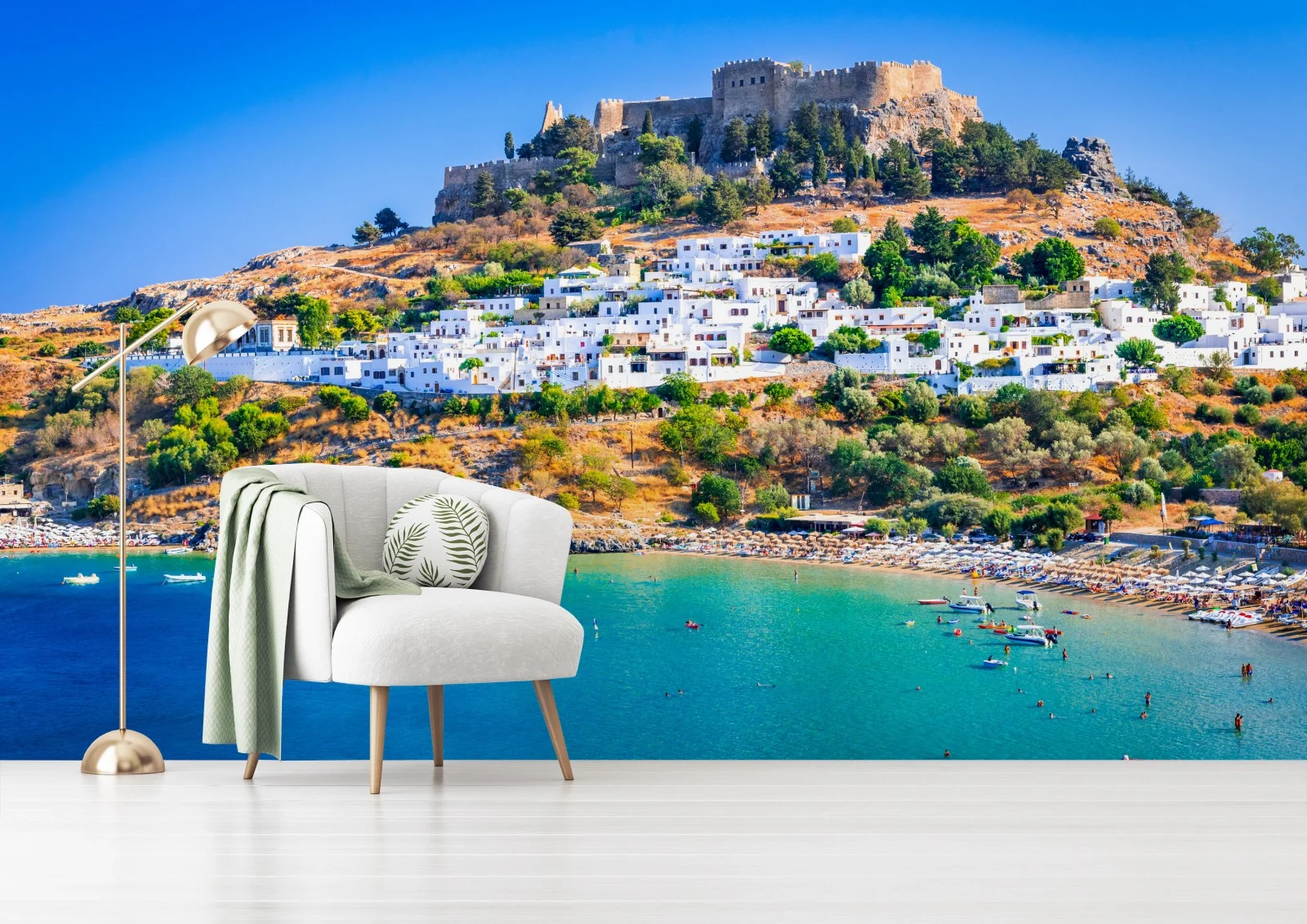 - grecia, case bianche, mare turchese, paesaggio mediterraneo, spiaggia, isola, lindos, acropoli, villaggio bianco, rodi