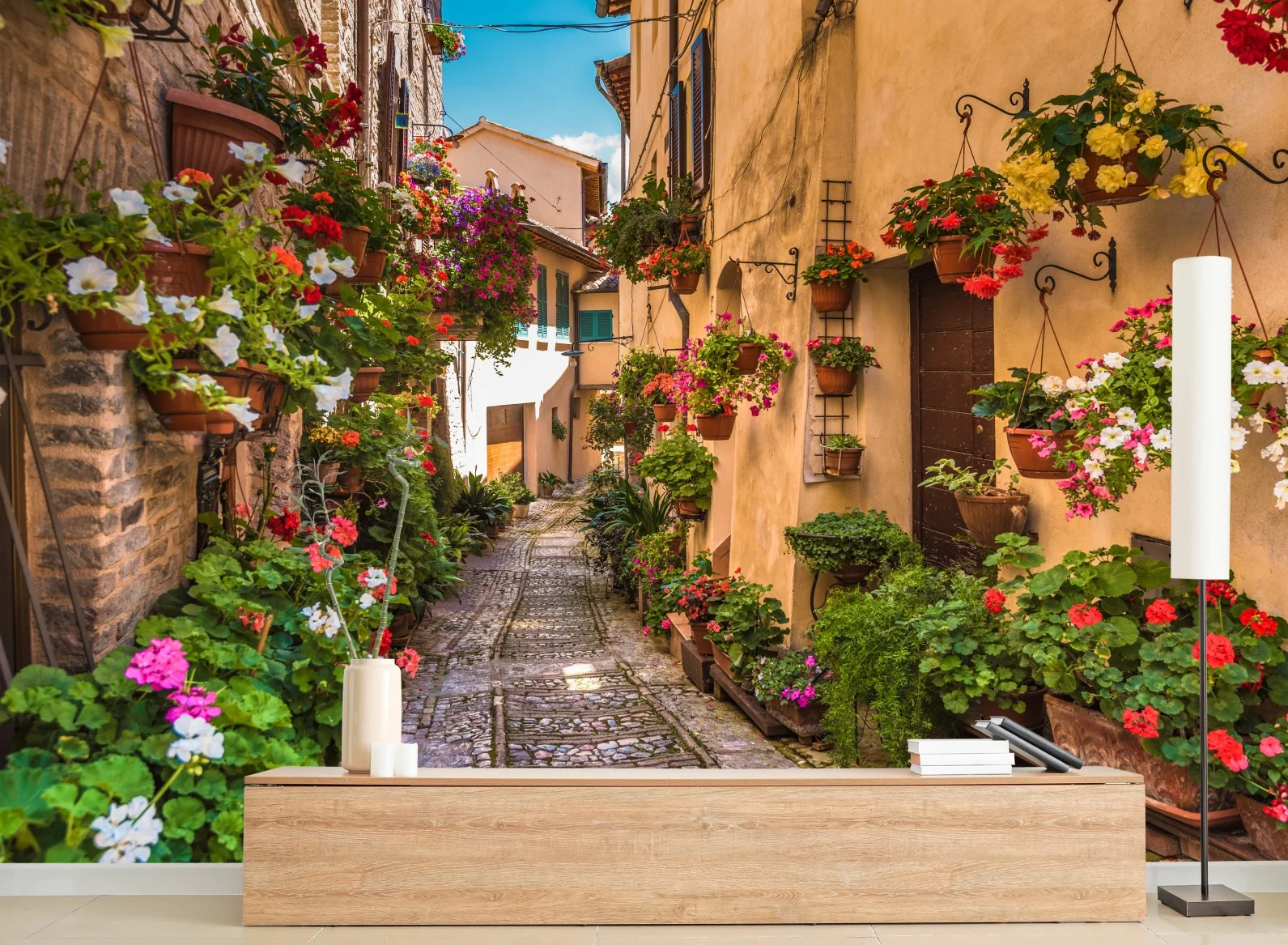 - paesaggio urbano, vicolo fiorito, strada lastricata, piante in vaso, borgo medievale, umbria, case in pietra, balconi fioriti, atmosfera romantica, turismo rurale
