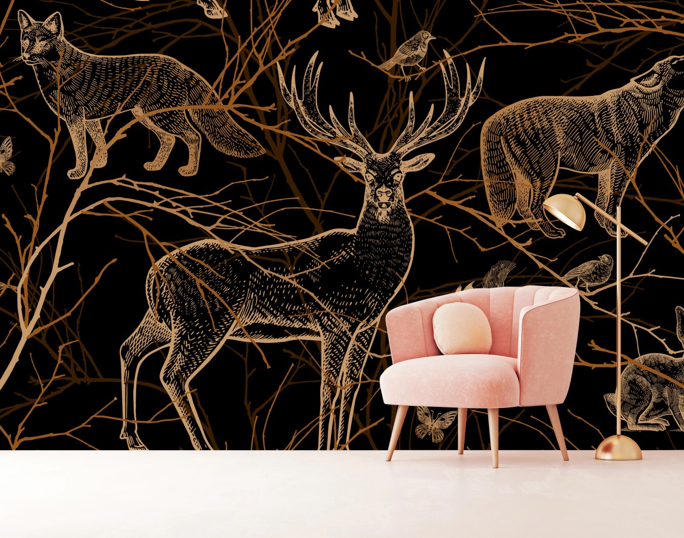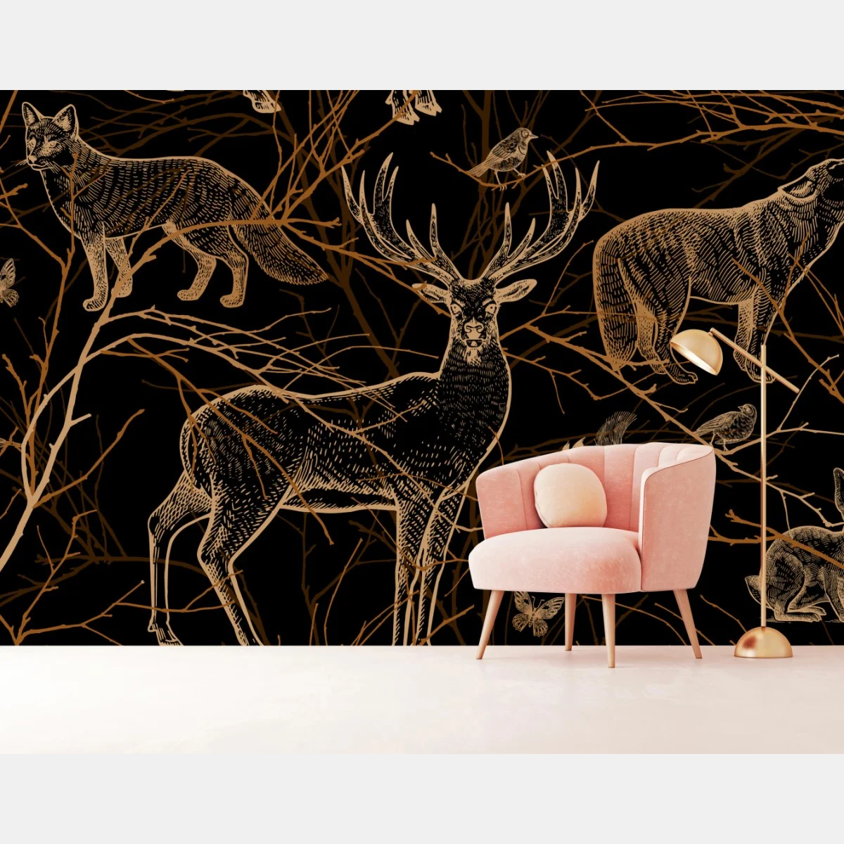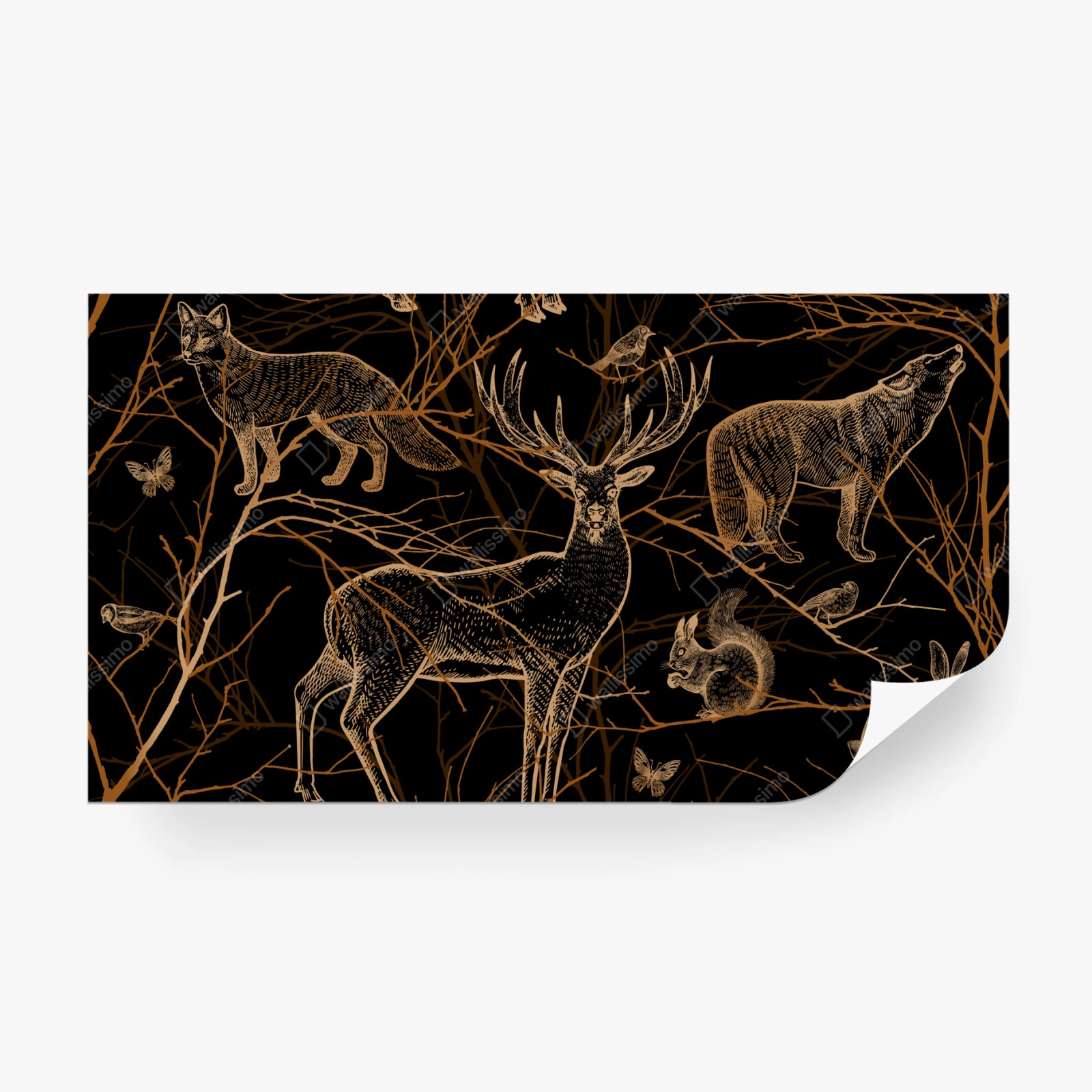 Carta da parati Foresta dorata: animali selvatici su sfondo nero