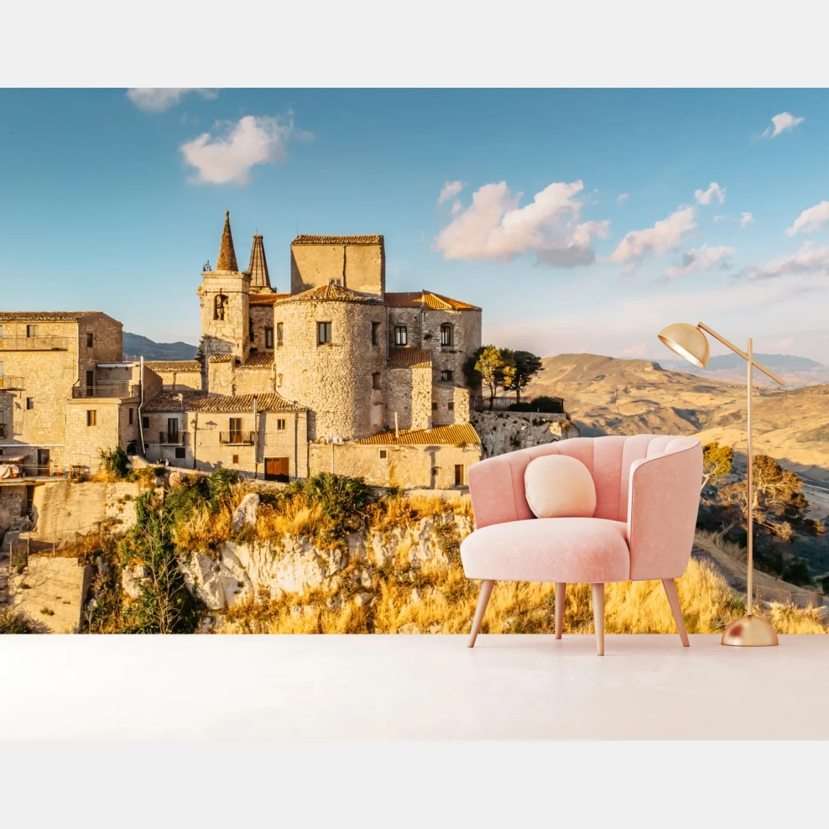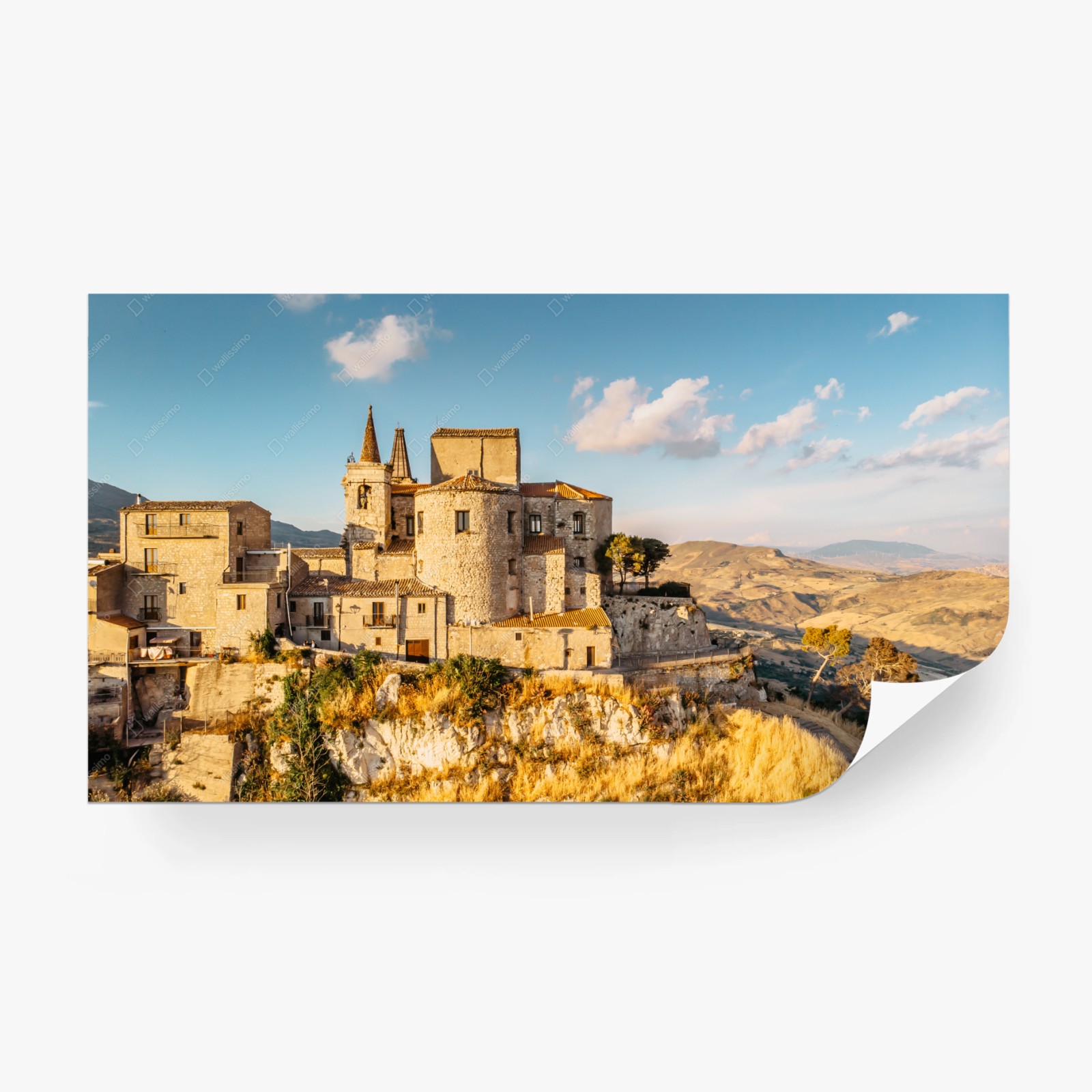 Scopri la magia di un borgo storico arroccato su scogliere dorate: un'immagine che dona calore e profondità agli ambienti, ideale per arredare con eleganza e carattere.Di piùMeno