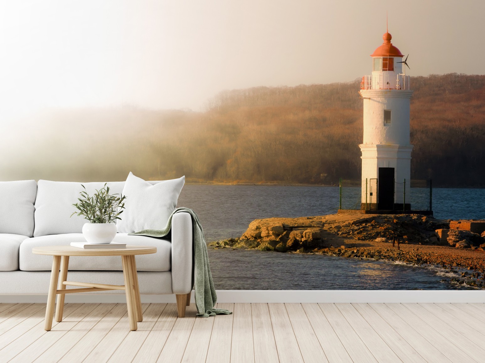 - mare, paesaggio marino, costa, tramonto, nebbia, orizzonte, luce dorata, scogliera, faro, atmosfera calma