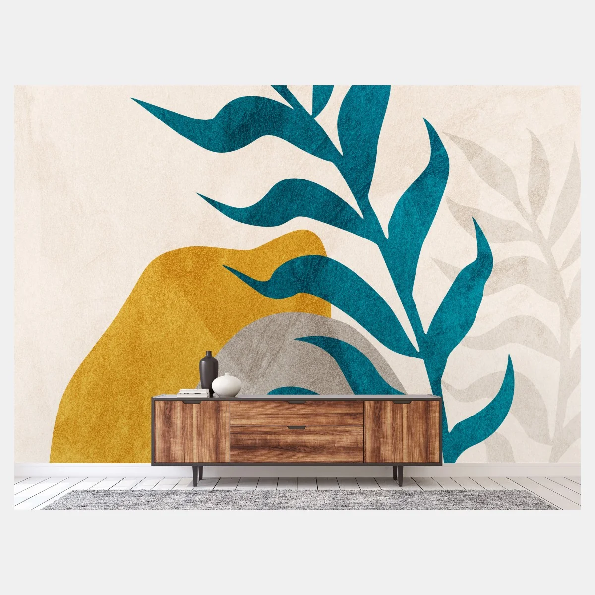 - minimalista, design moderno, foglie, astratto, stile mid-century, forme organiche, ocra, composizione botanica, tonalità turchese, textura carta