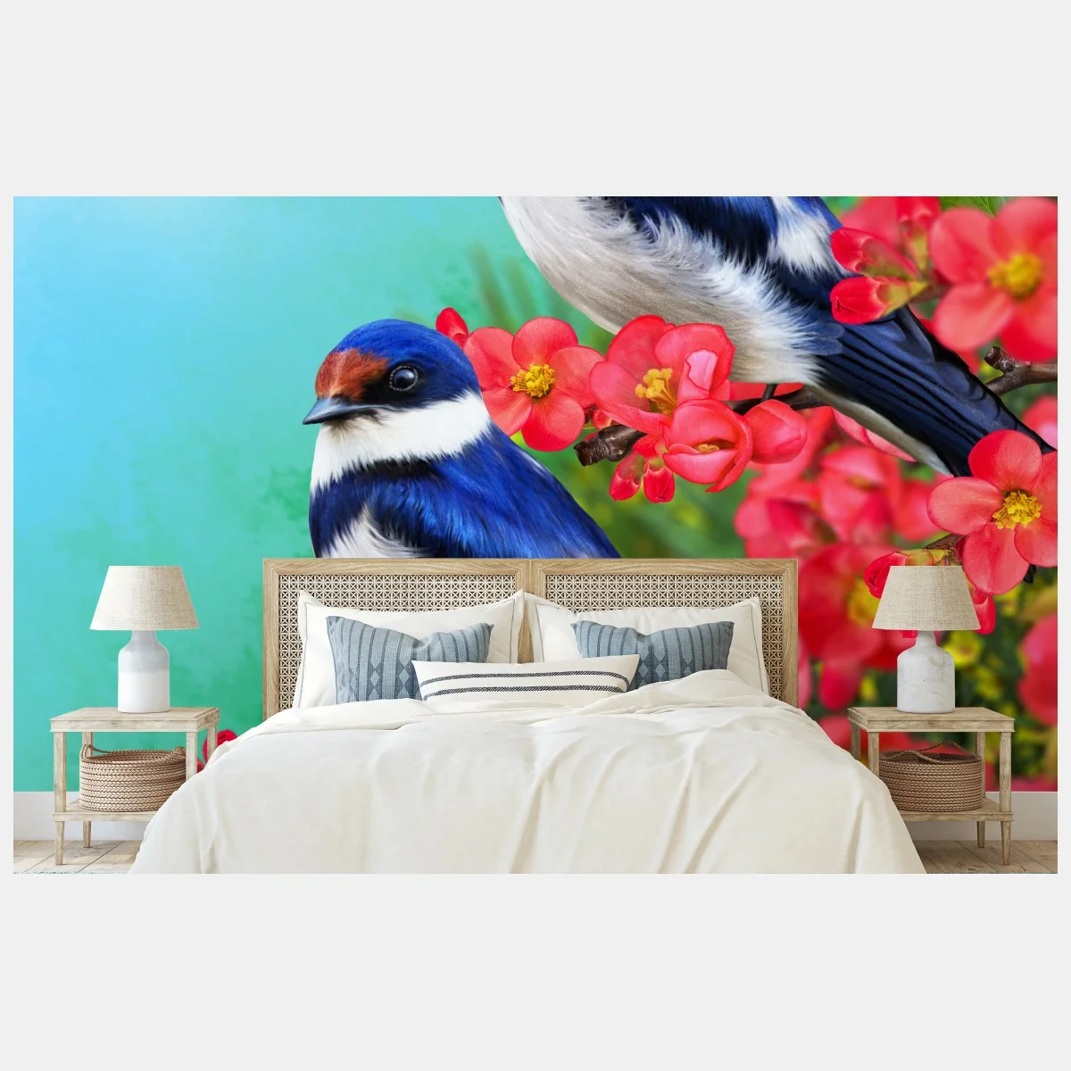 - natura, fiori, giardino, decorazione murale, primavera, uccelli, rondini, arte digitale, colore vivace, stampe floreali