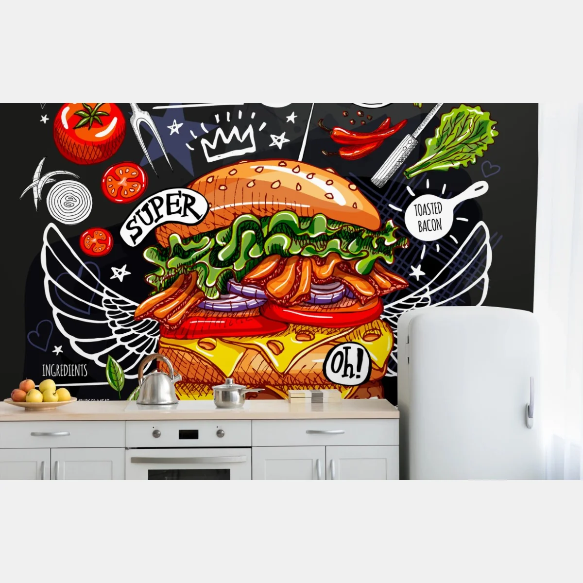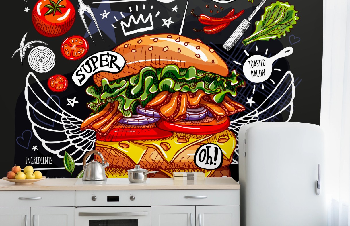 Carta da parati Hamburger gourmet illustrato su sfondo lavagna