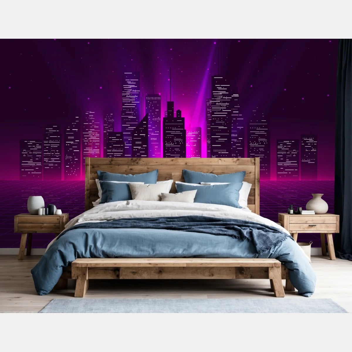 - città, grattacieli, cielo stellato, neon, auto, synthwave, retro-futuristico, viaggio notturno, luce viola, griglia digitale