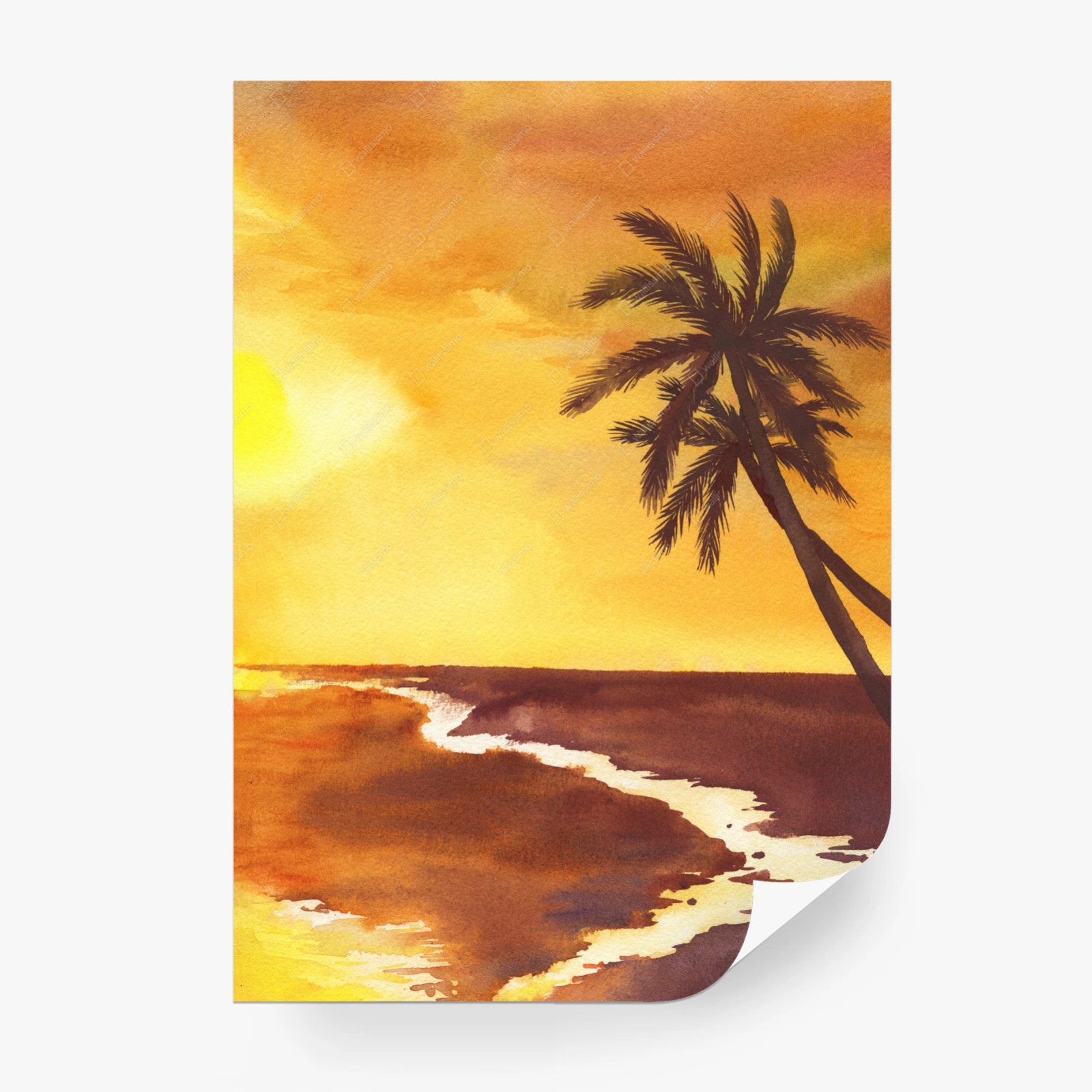 - vacanza, spiaggia, palme, tramonto, paesaggio tropicale, onde, colori caldi, silhouette, sera, acquerello