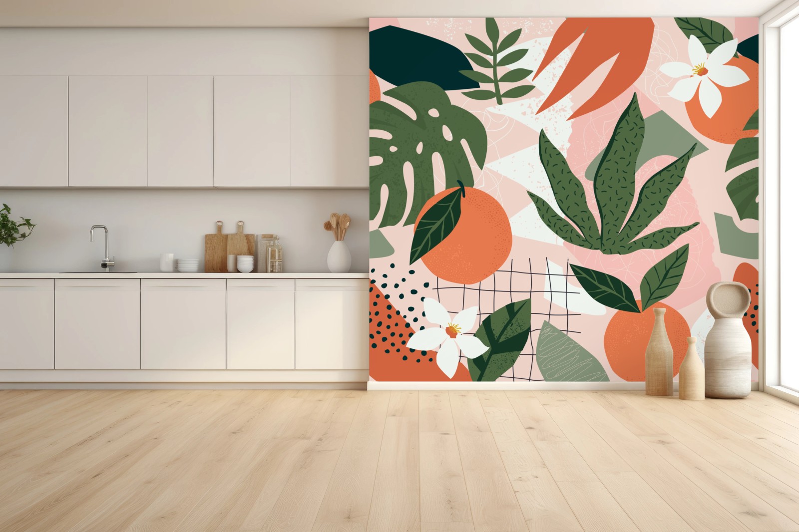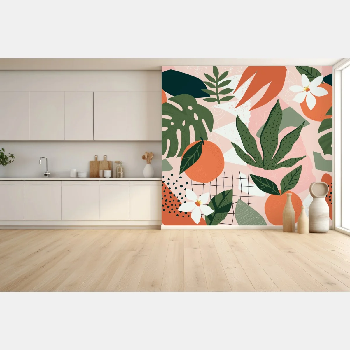 Ravviva gli ambienti con questo motivo botanico di arance, foglie e fiori in una delicata palette pastello, ideale per aggiungere un tocco moderno e naturale alle pareti.Di piùMeno