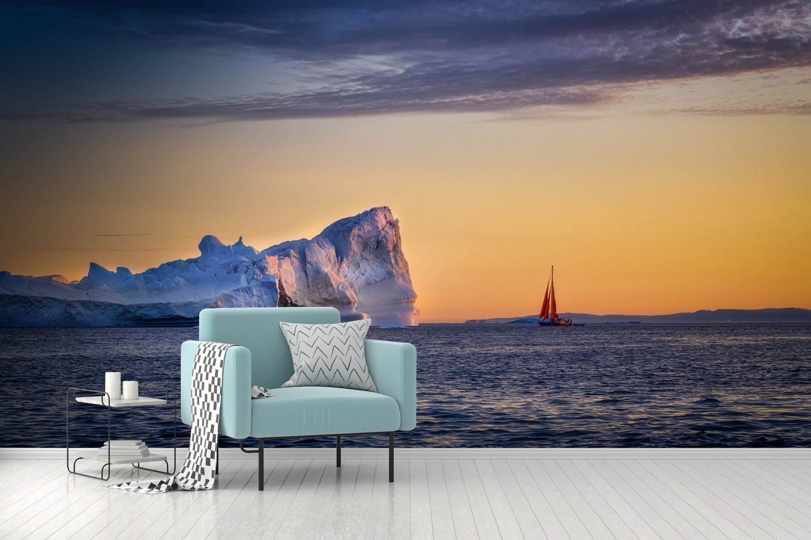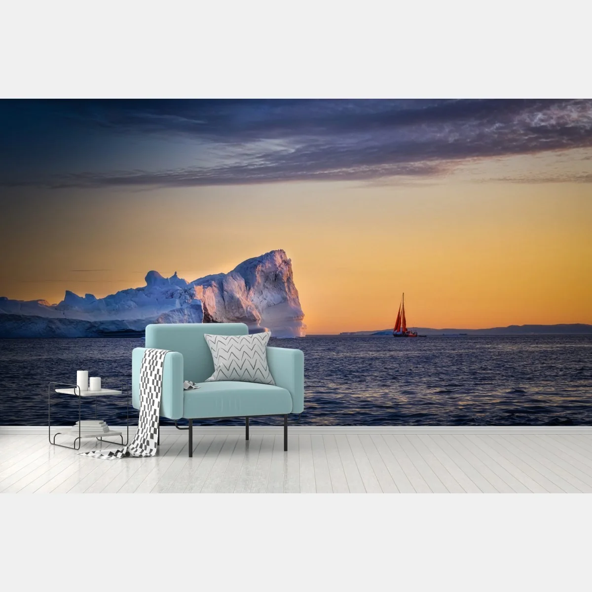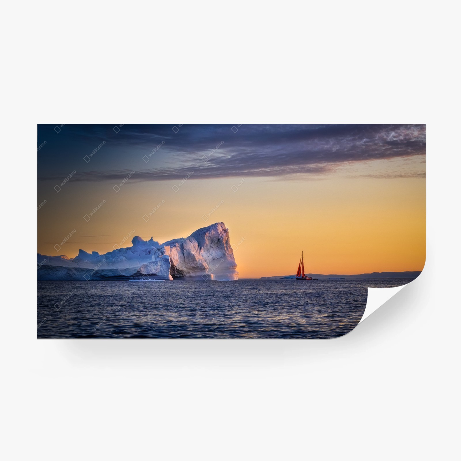 Carta da parati Tramonto artico con iceberg e vela rossa