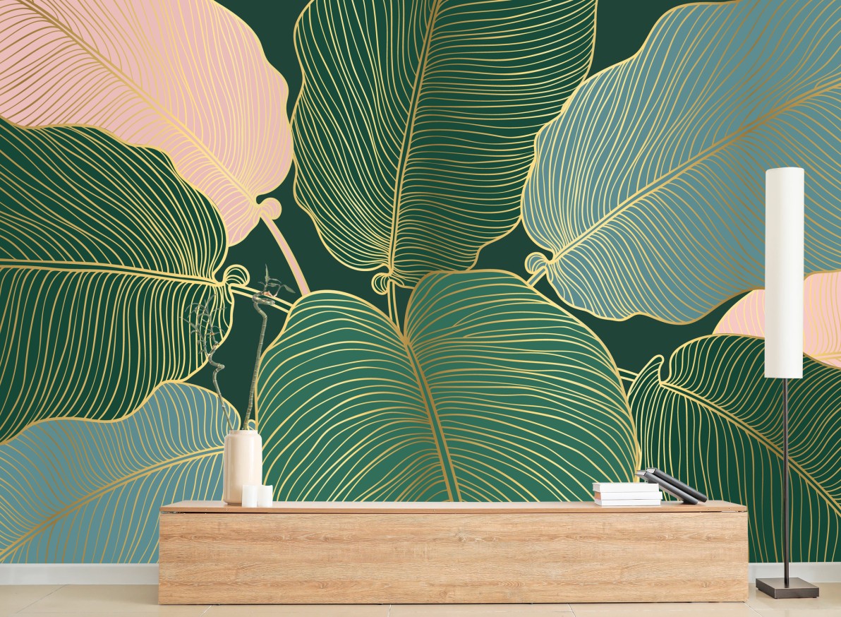 Carta da parati Motivo botanico dorato su sfondo verde