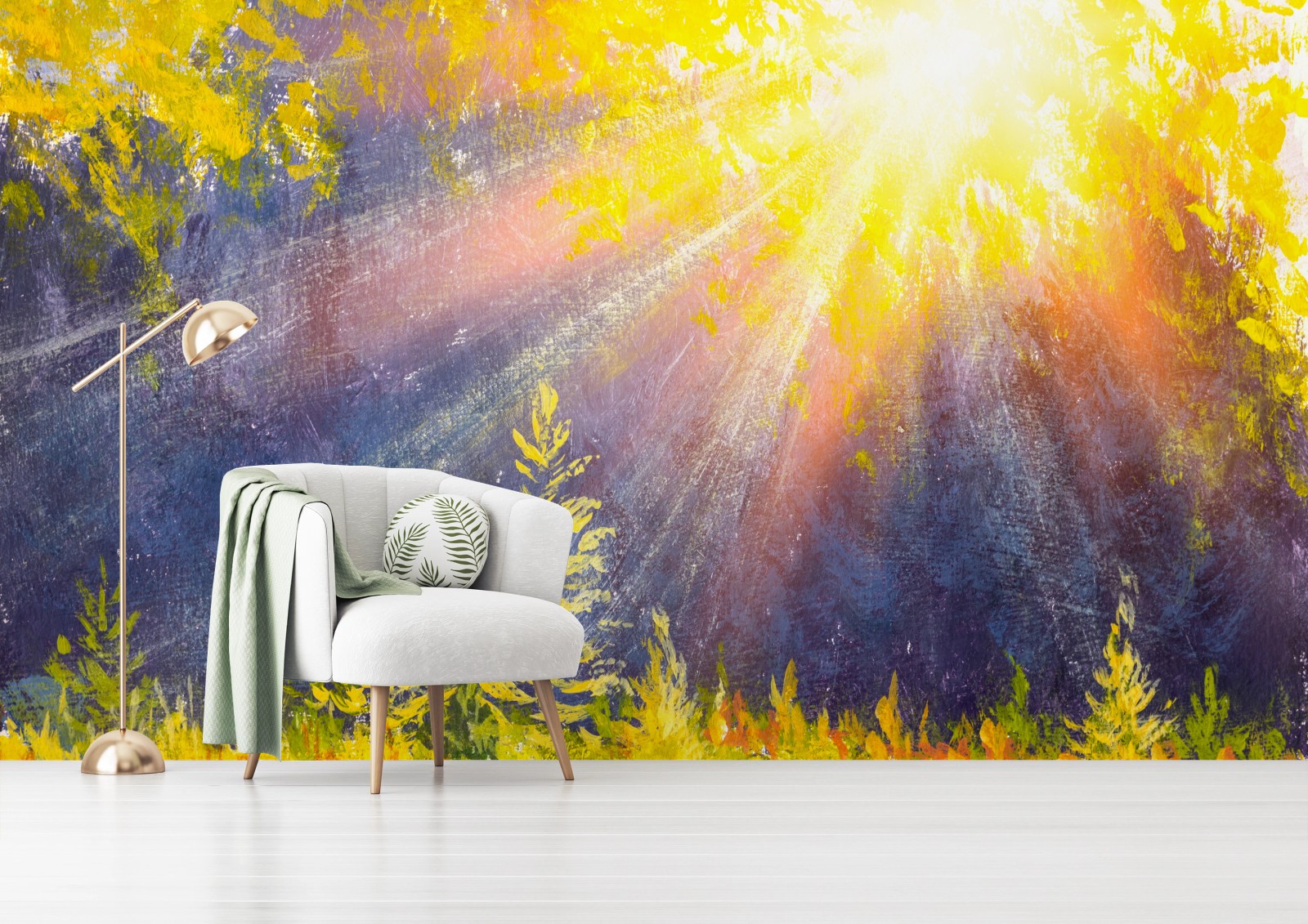 Carta da parati Sole dorato nella foresta ad acquerello
