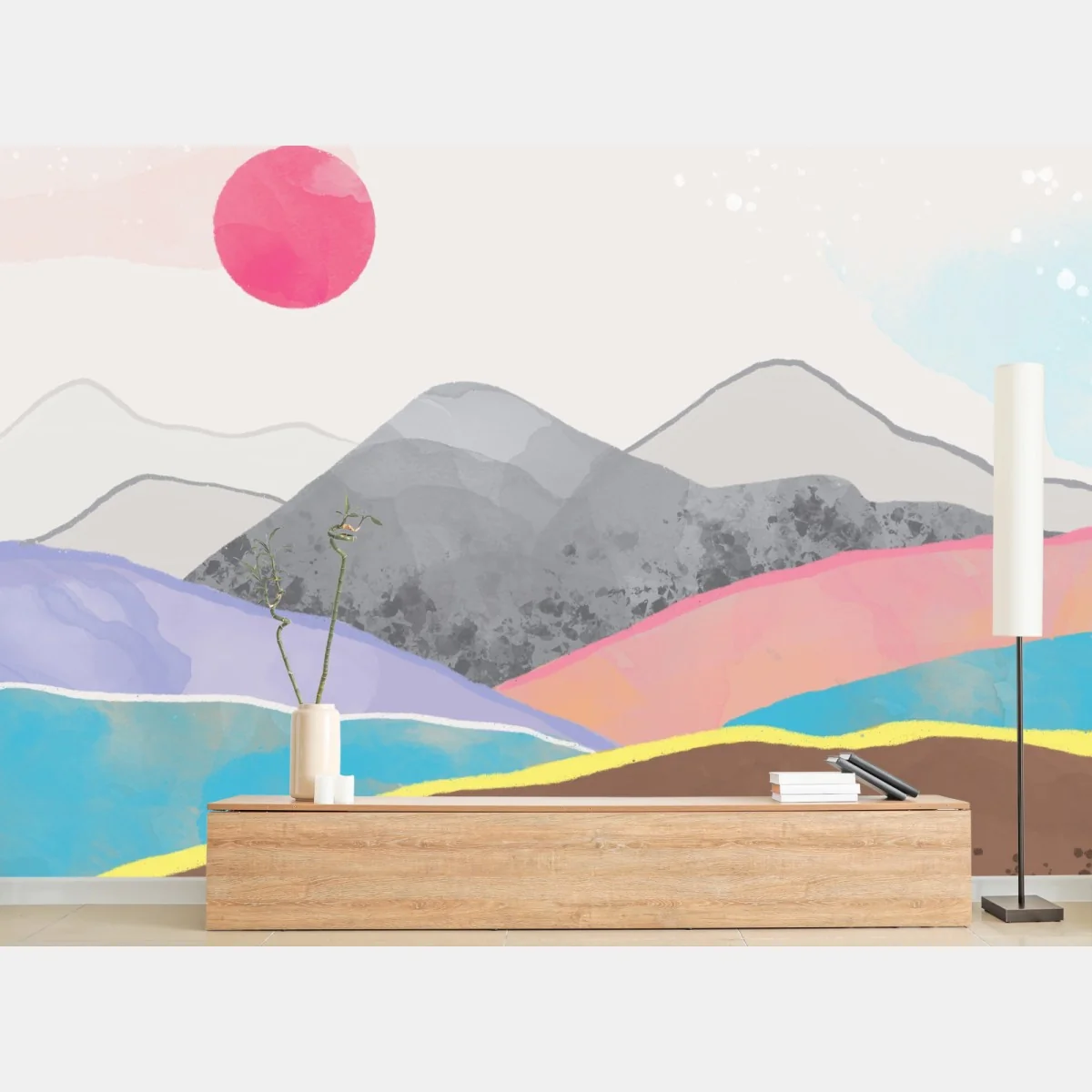 - natura, paesaggio, montagne, tramonto, minimalista, decorazione murale, astratto, colori pastello, acquerello, arte moderna
