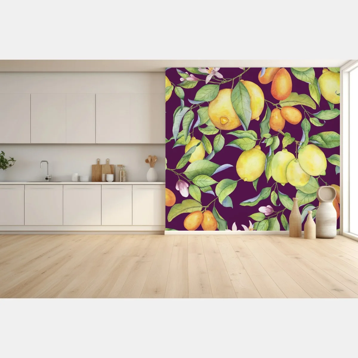 Carta da parati Motivo di agrumi e foglie su sfondo viola