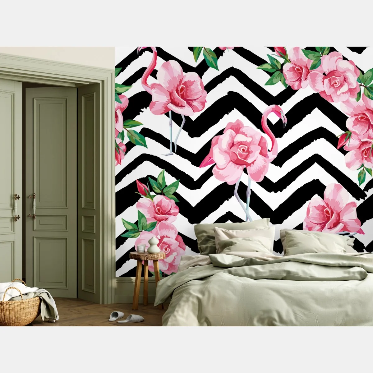 Carta da parati Fenicotteri rosa e rose su sfondo zigzag