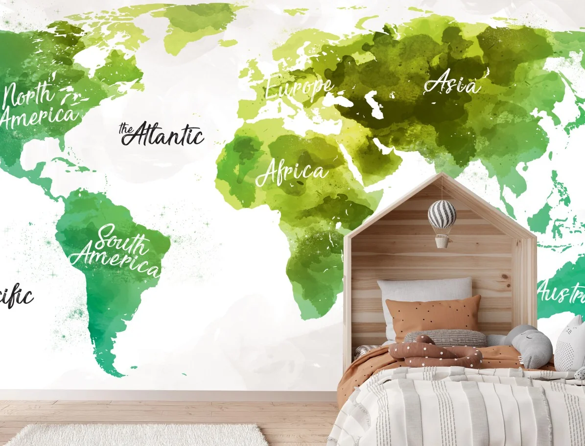 - verde, oceano, mappa del mondo, continenti, decorazione murale, acquerello, arte da parete, esplorazione, viaggi, carta geografica