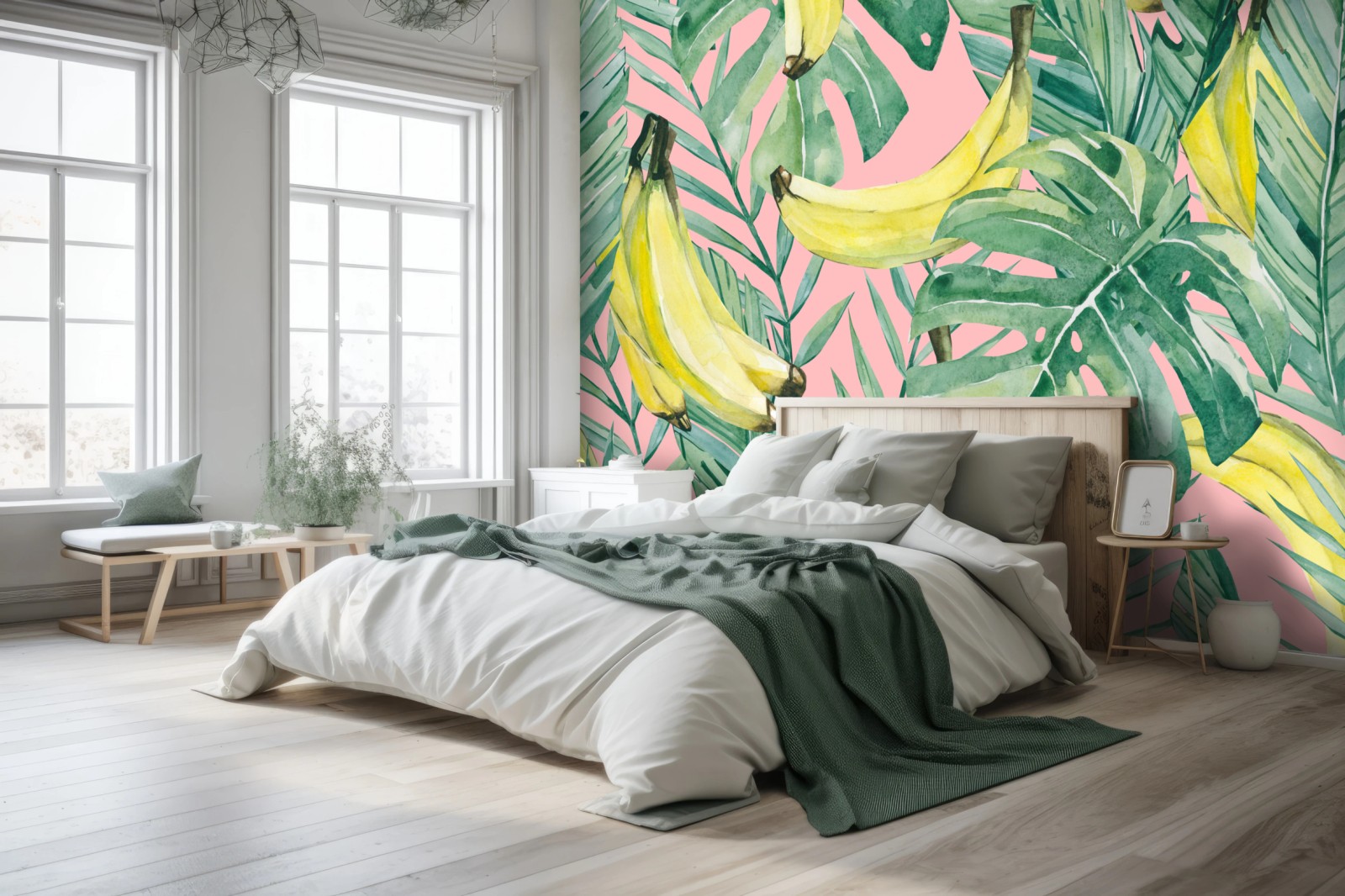 Carta da parati Motivo tropicale banane e foglie acquerello su sfondo rosa