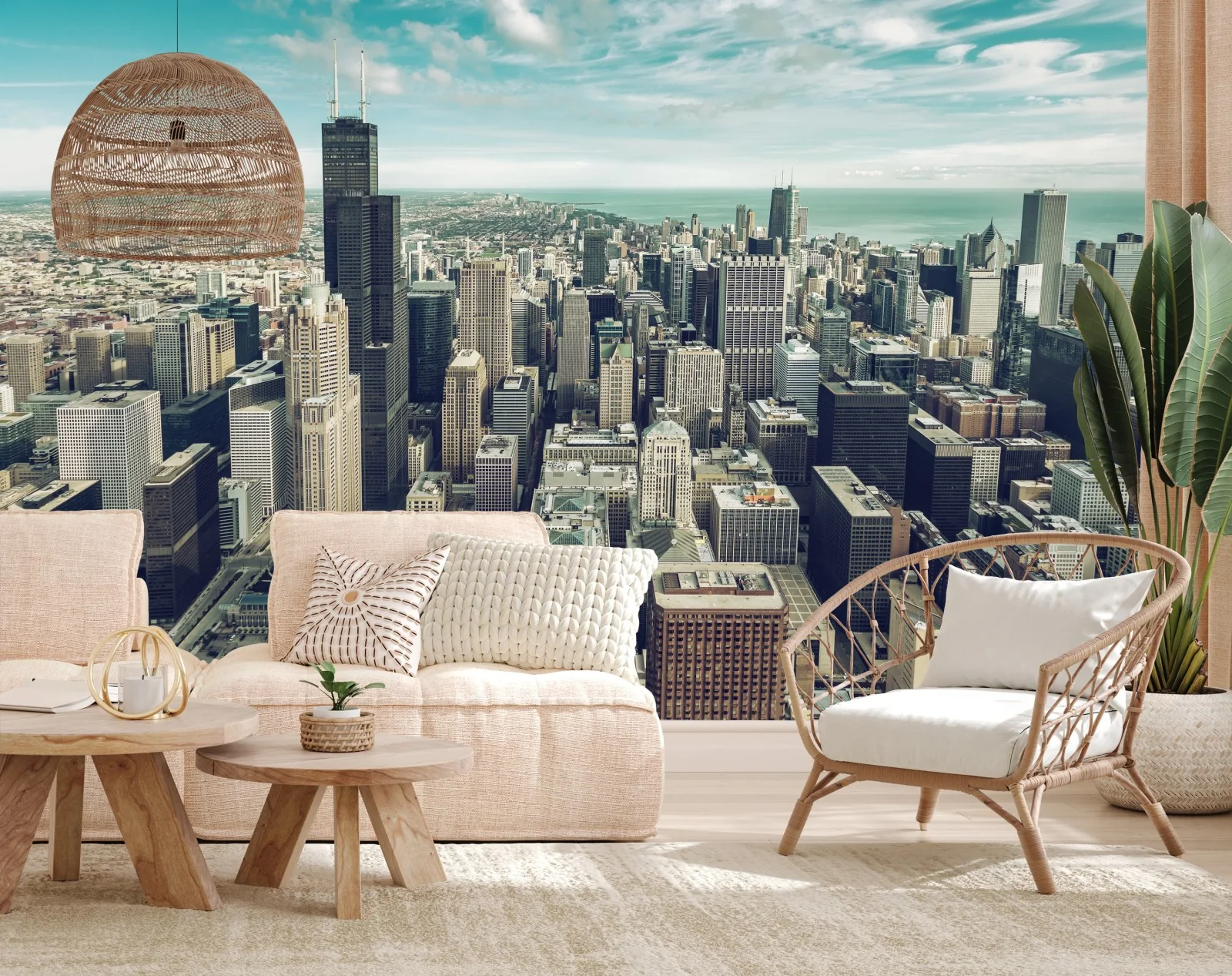 - grattacieli, panorama aereo, vintage, centro città, architettura urbana, orizzonte urbano, fotografia panoramica, skyline di chicago, città metropolitana, lago michigan