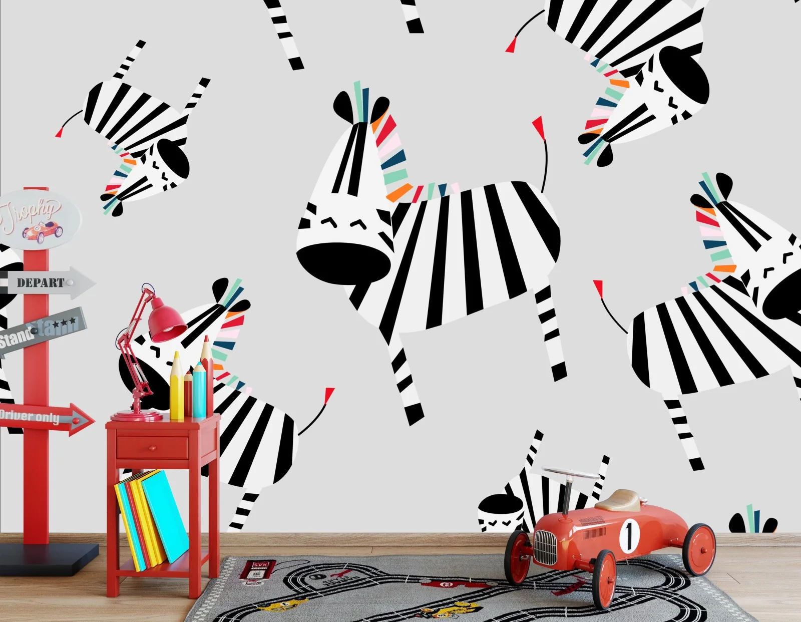 Carta da parati Zebre giocose su sfondo grigio