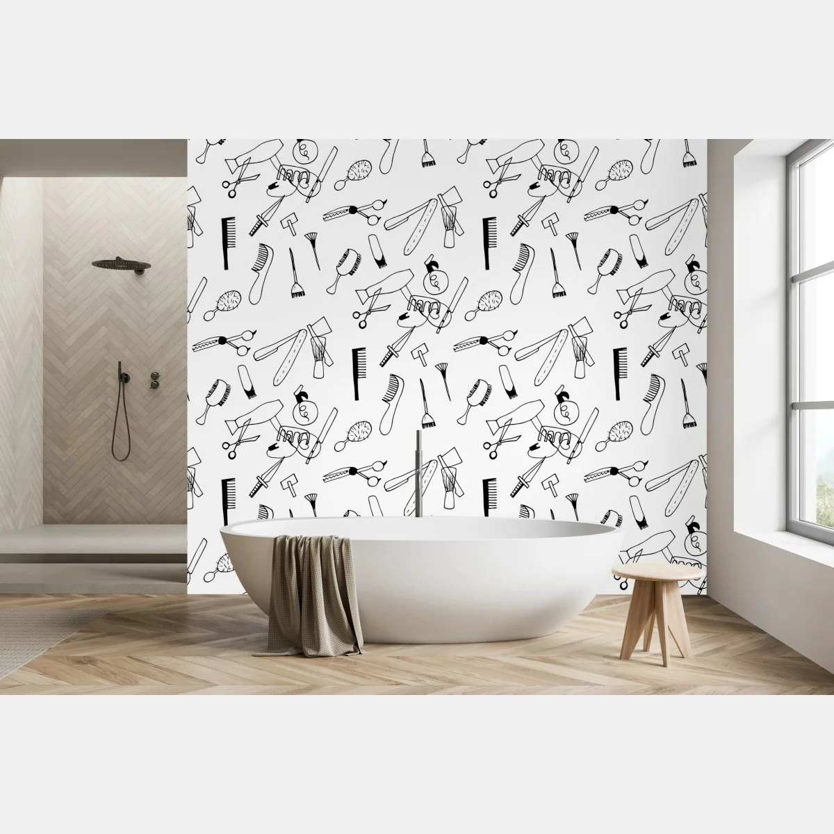 Carta da parati Motivo strumenti da parrucchiere in bianco e nero