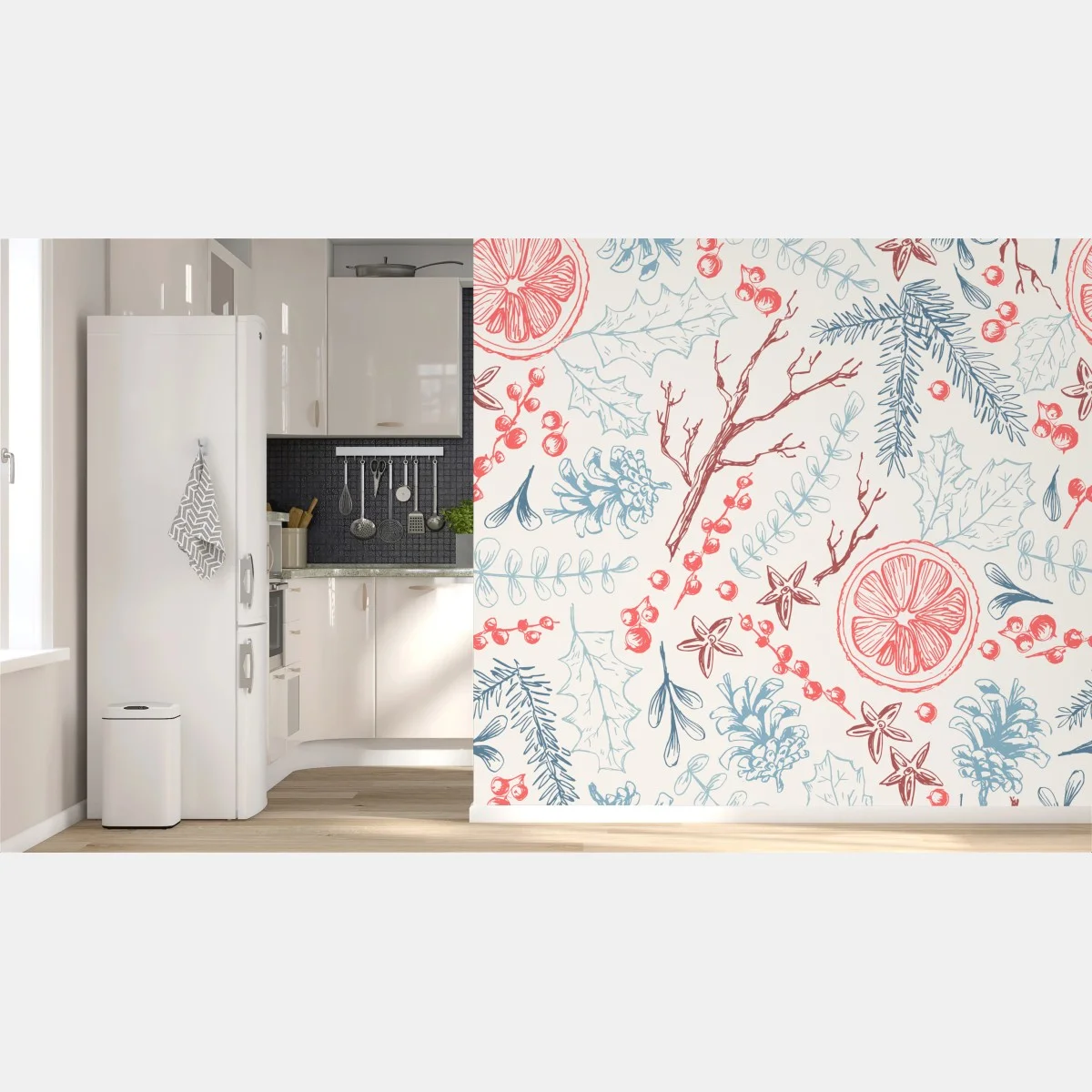 Carta da parati Motivo botanico invernale con agrumi e pigne