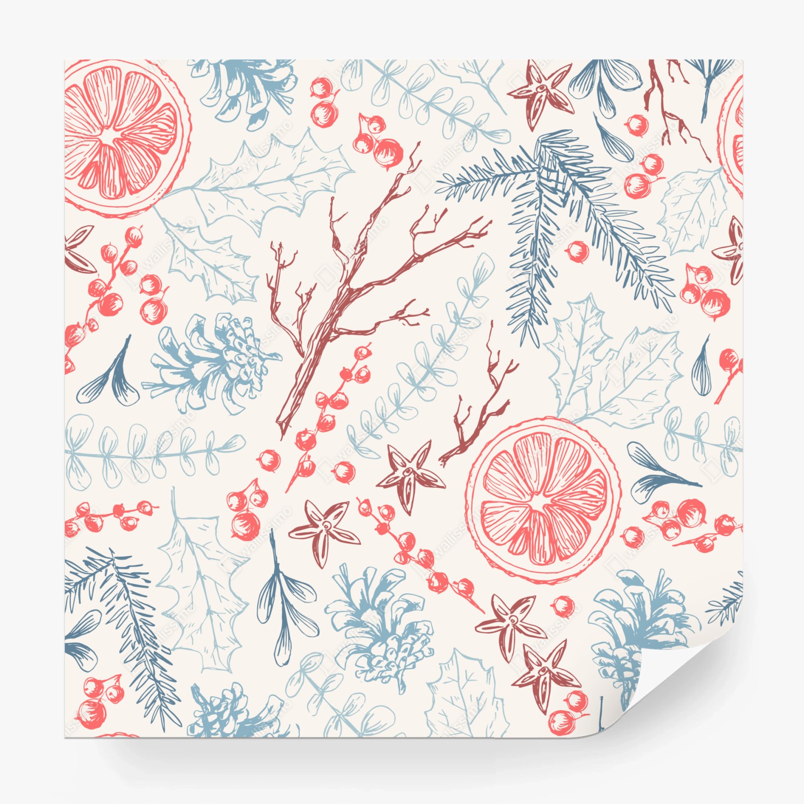 - colori pastello, agrumi, pattern botanico, bacche, motivo natalizio, pigne, foglie di agrifoglio, anice stellato, rami spogli, stile schizzo
