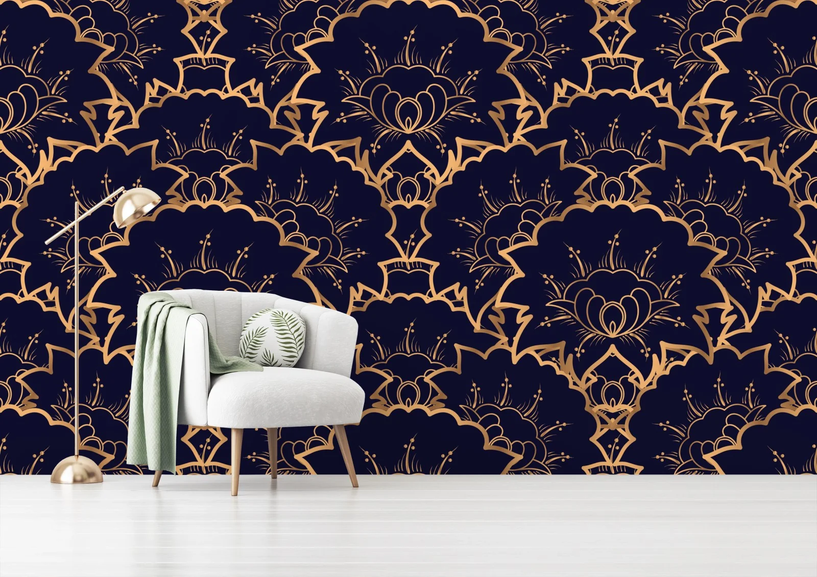 Carta da parati Eleganza ornamentale dorata su blu notte