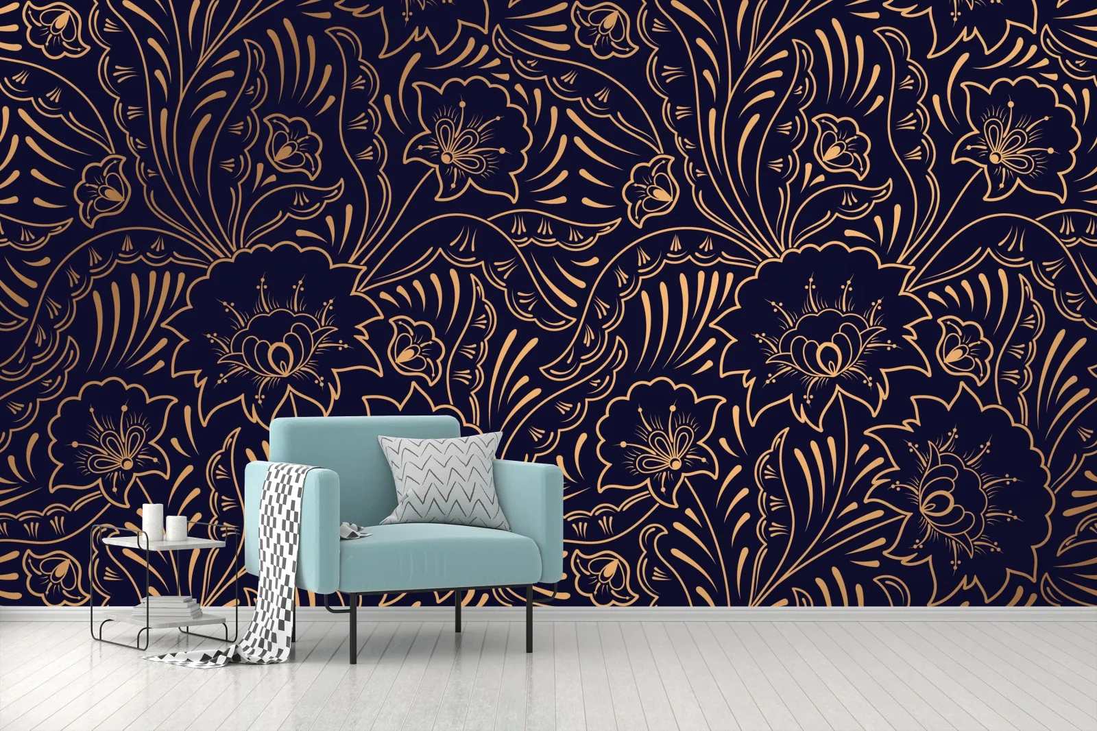 Carta da parati Motivo floreale elegante in blu notte e oro