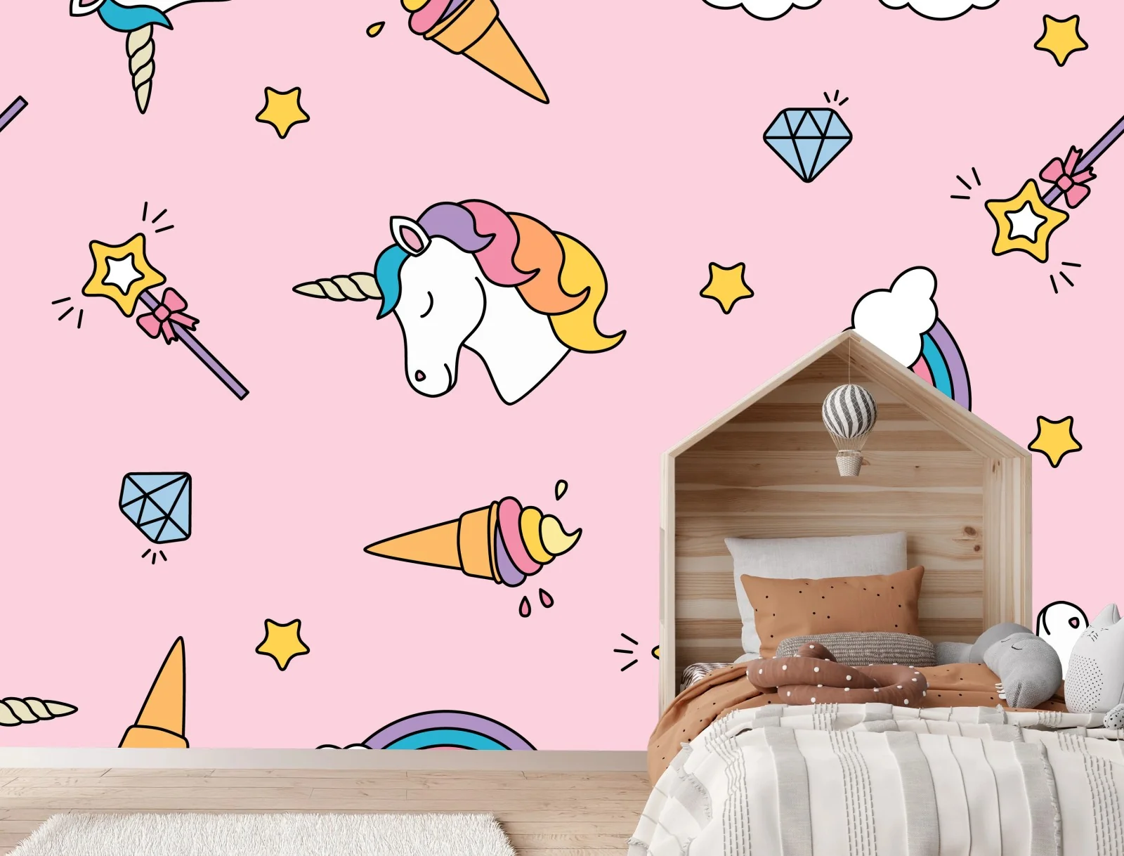 Carta da parati Motivo magico di unicorni e arcobaleni su sfondo rosa