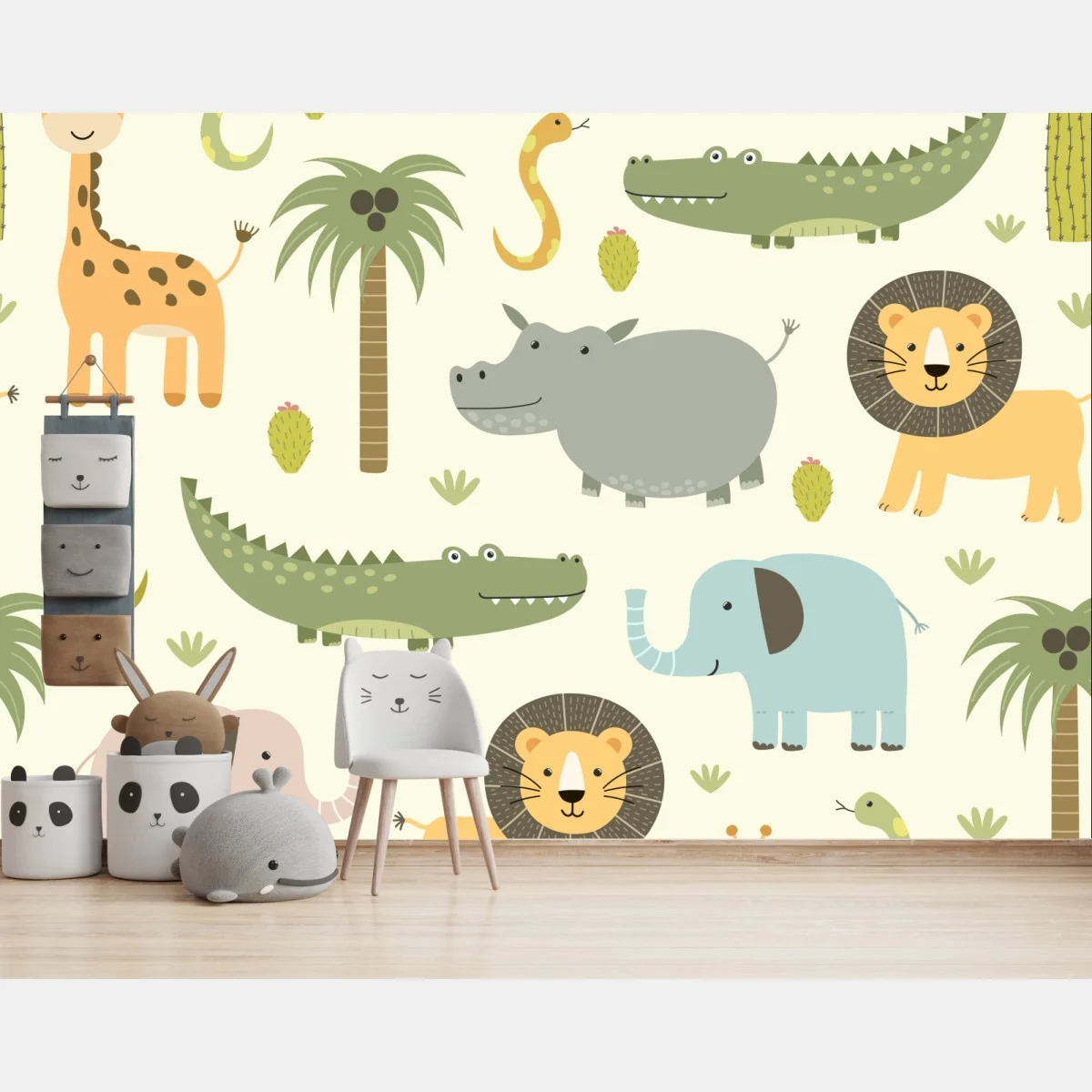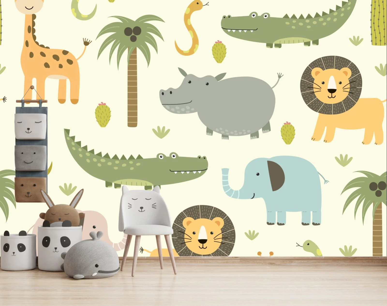 - palme, pattern, animali, safari, elefante, leone, giraffa, ippopotamo, coccodrillo, serpente