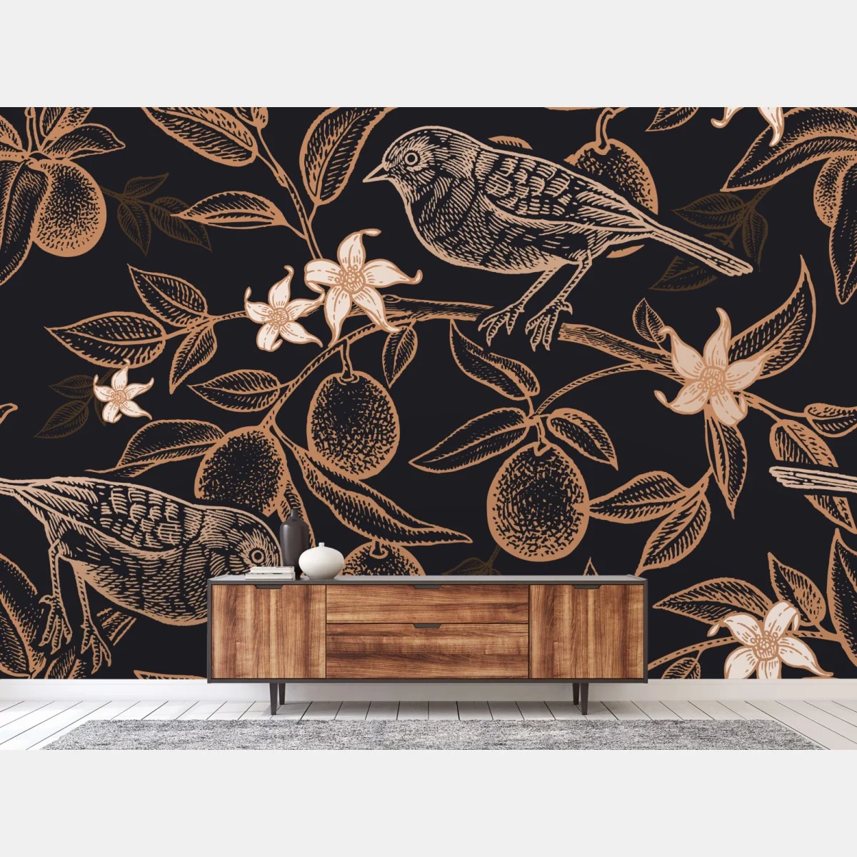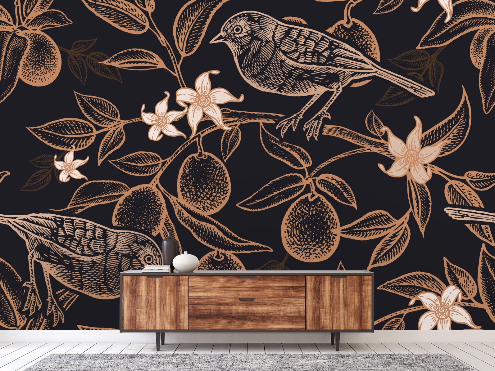 Carta da parati Motivo botanico con uccelli e agrumi su sfondo scuro