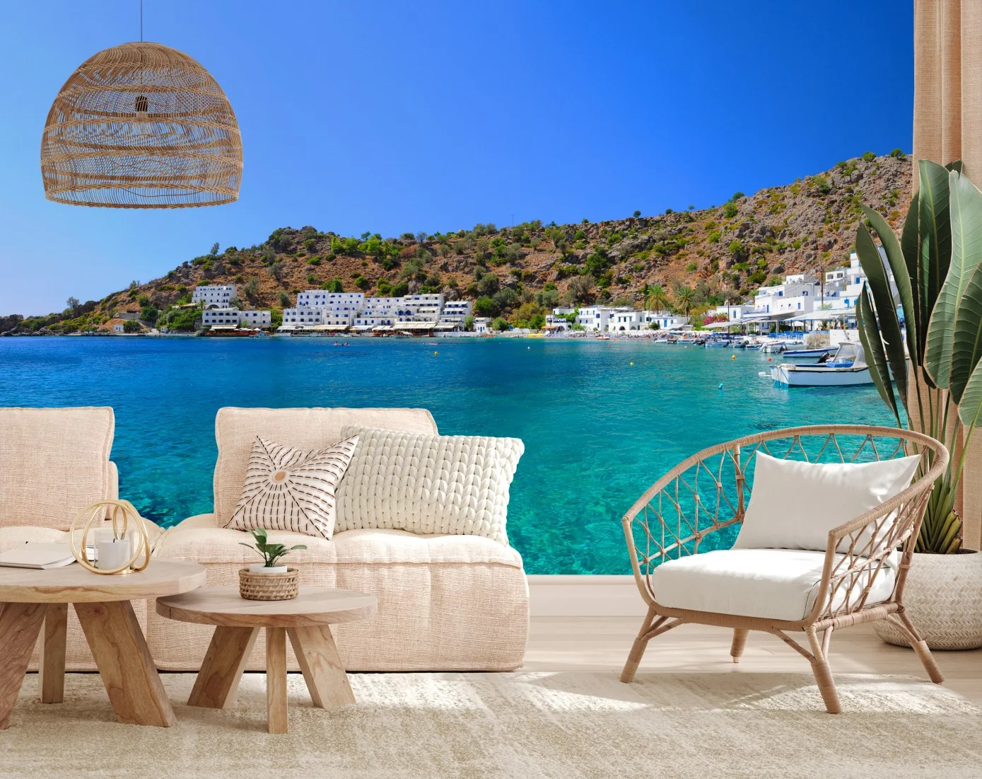 - cielo azzurro, case bianche, vacanze, spiaggia, mare, paesaggio marino, barche, costa, acqua cristallina, porto