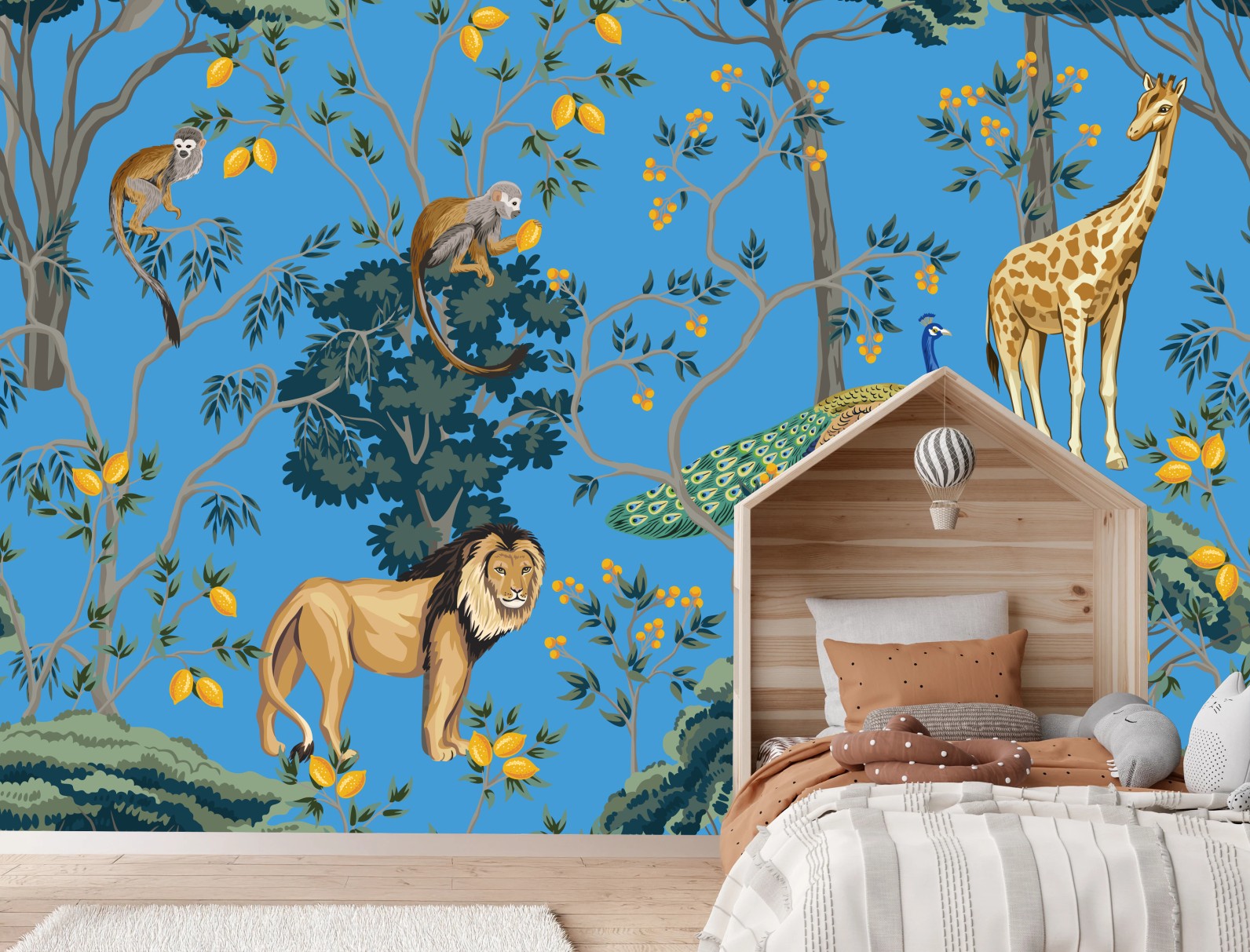 - giungla, illustrazione, animali, esotico, motivo botanico, pavone, leone, giraffa, scimmie, sfondo blu