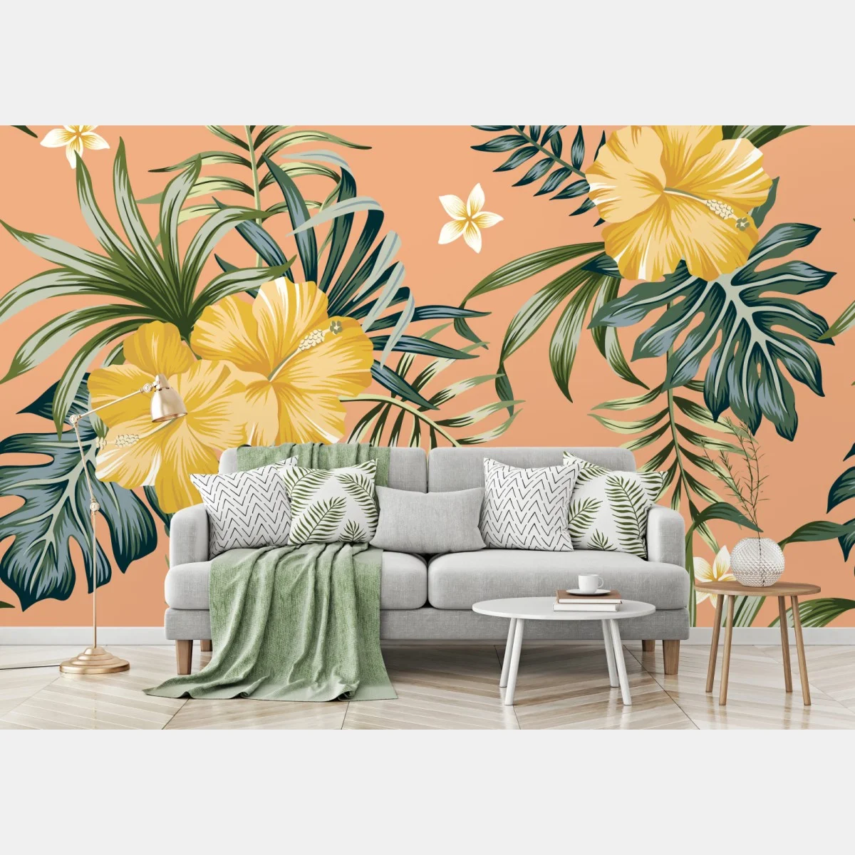 Carta da parati Motivo botanico tropicale con ibisco giallo