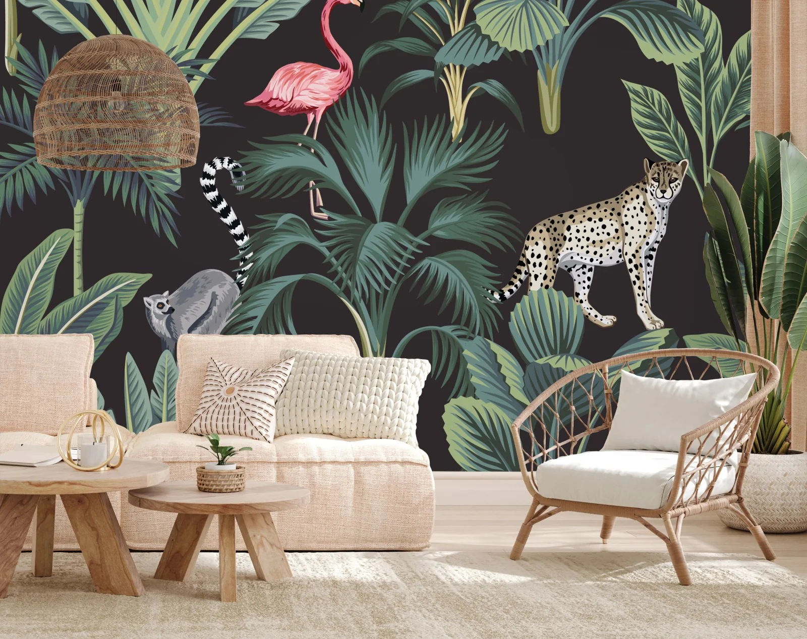 - natura, palme, giungla, tropicale, illustrazione, esotico, foglie, ghepardo, fenicottero, lemure