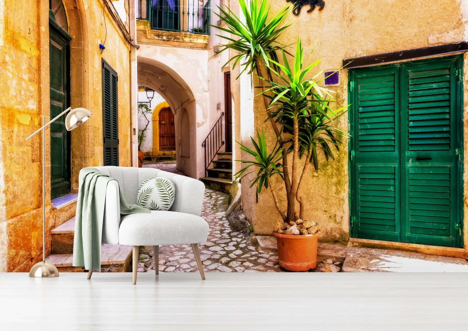 - piante in vaso, atmosfera mediterranea, colori caldi, vicolo, decorazione d'interni, archi, strada ciottolata, porte verdi, persiane, case antiche
