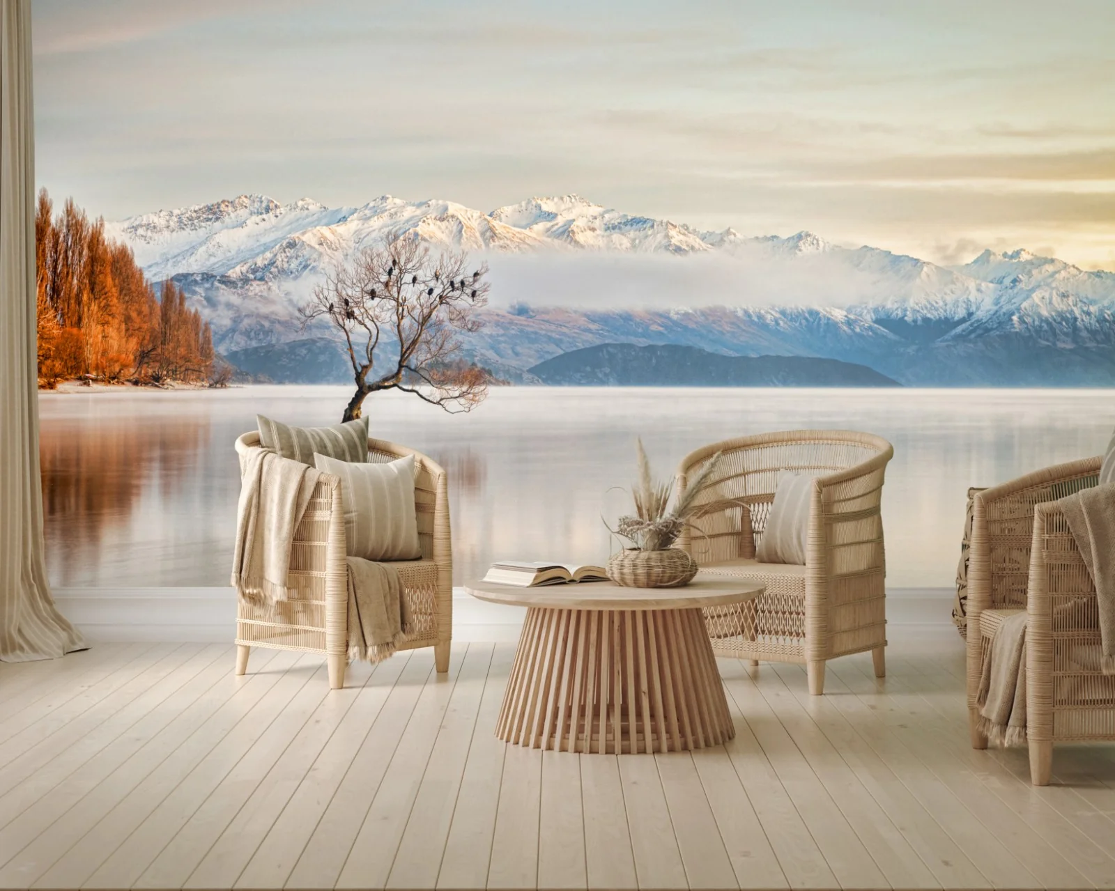 - paesaggio, lago, riflesso, inverno, nebbia, montagne innevate, nuova zelanda, uccelli, albero solitario, wanaka