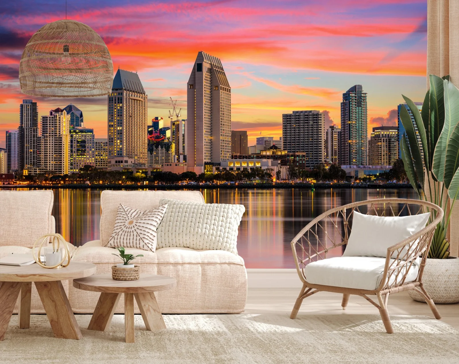 - colori vivaci, skyline, paesaggio urbano, tramonto, città, grattacieli, luce dorata, baia, riflessi sull'acqua, san diego