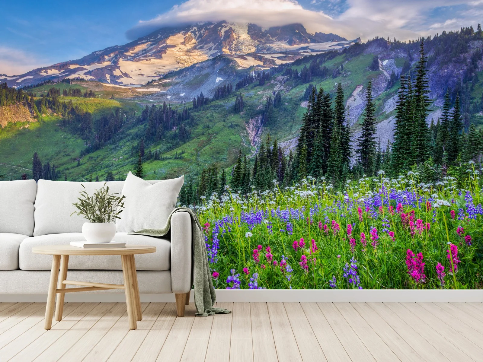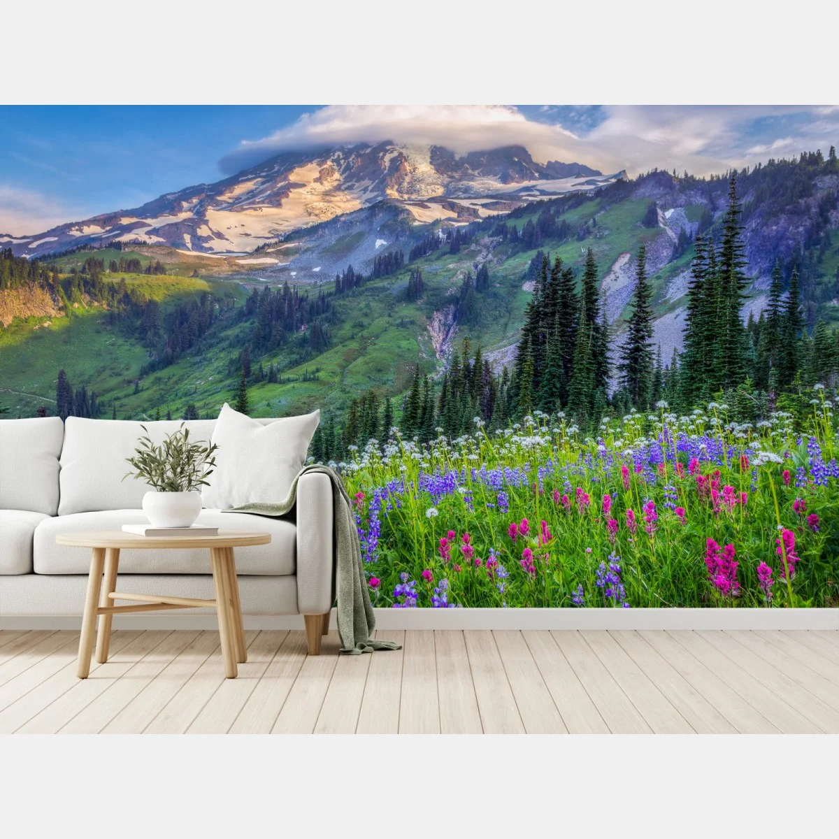 Carta da parati Prato alpino fiorito con vista sulla montagna