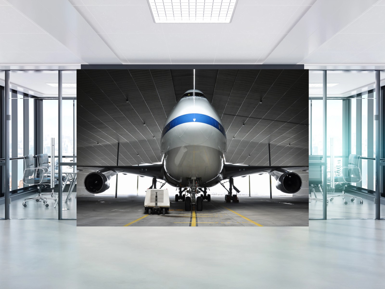 - aereo, aviazione, design industriale, ingegneria aeronautica, maestoso, hangar, vista frontale, motore a reazione, ombre e luci, terminal